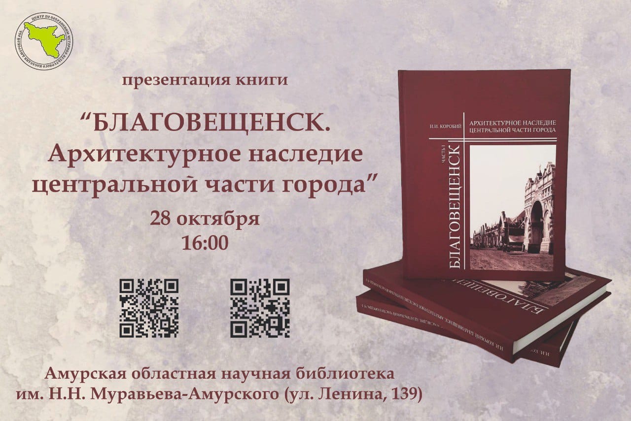 Государственная инспекция по охране объектов культурного наследия Амурской области и Центр по сохранению историко-культурного наследия Амурской области приглашают на презентацию книги «Благовещенск. Архитектурное наследие центральной части города», которая состоится 28 октября в 16:00.
