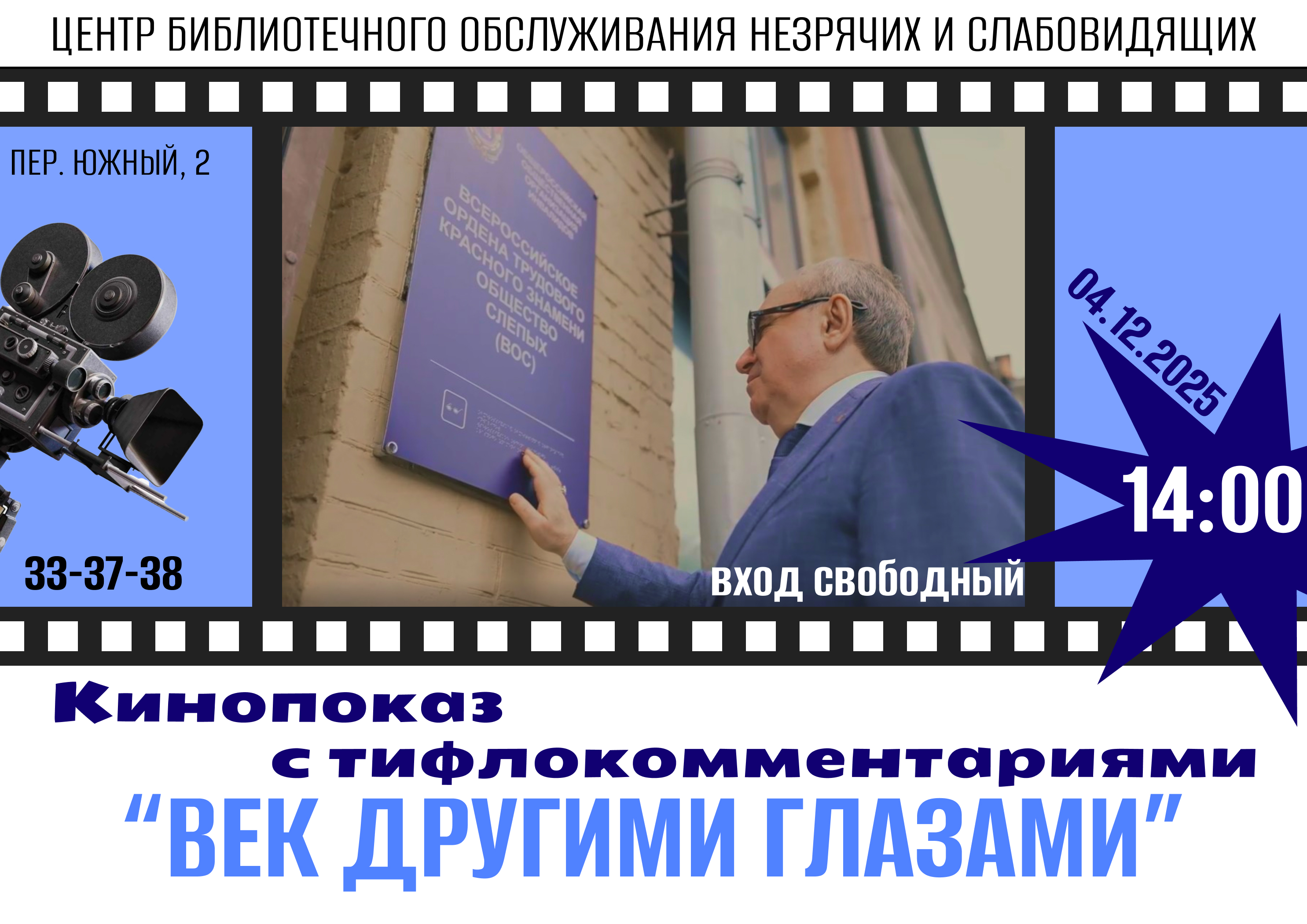 4 декабря в 14:00 Центр библиотечного обслуживания незрячих и слабовидящих (пер. Южный, 2) приглашает всех желающих на кинопоказ документального фильма с тифлокомментариями «Век другими глазами».