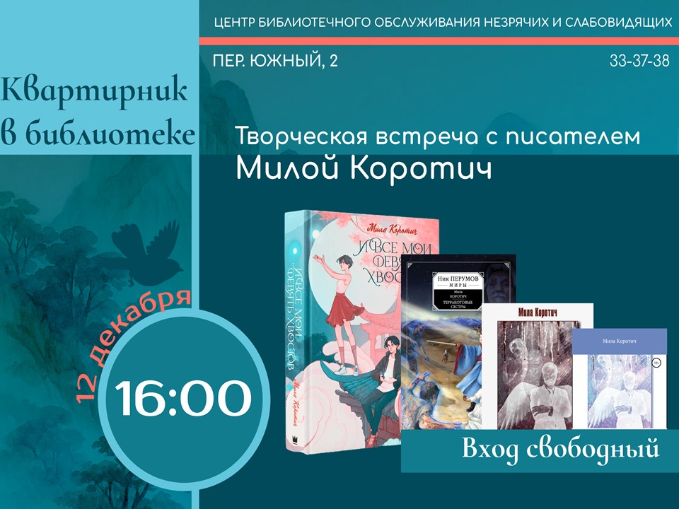 12 декабря в 16:00 Центр библиотечного обслуживания незрячих и слабовидящих (пер. Южный, 2) приглашает всех желающих на творческую встречу с писательницей Милой Коротич.