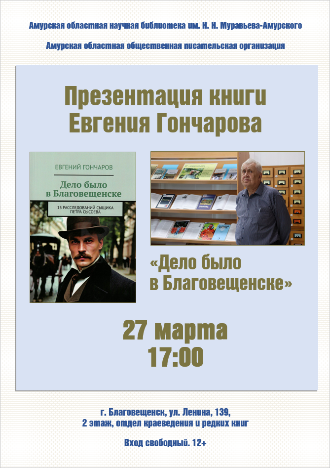 Друзья, 27 марта известный амурский журналист, прозаик Евгений Петрович Гончаров презентует в стенах главной библиотеки Приамурья новую книгу «Дело было в Благовещенске».