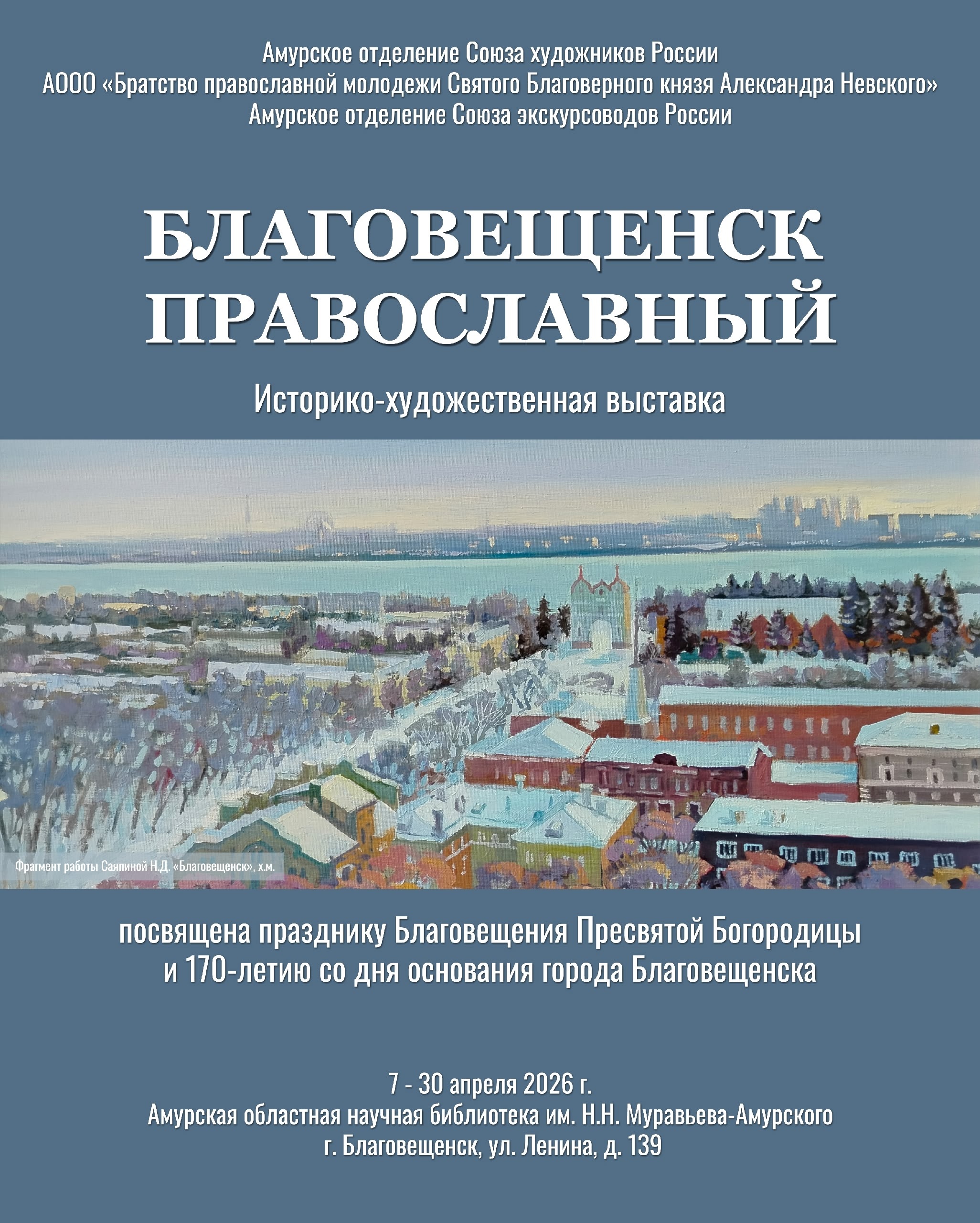 Организаторы выставки: Амурское отделение Союза художников России, АООО «Братство православной молодёжи им. Святого Благоверного князя Александра Невского» и Амурское отделение экскурсоводов России.