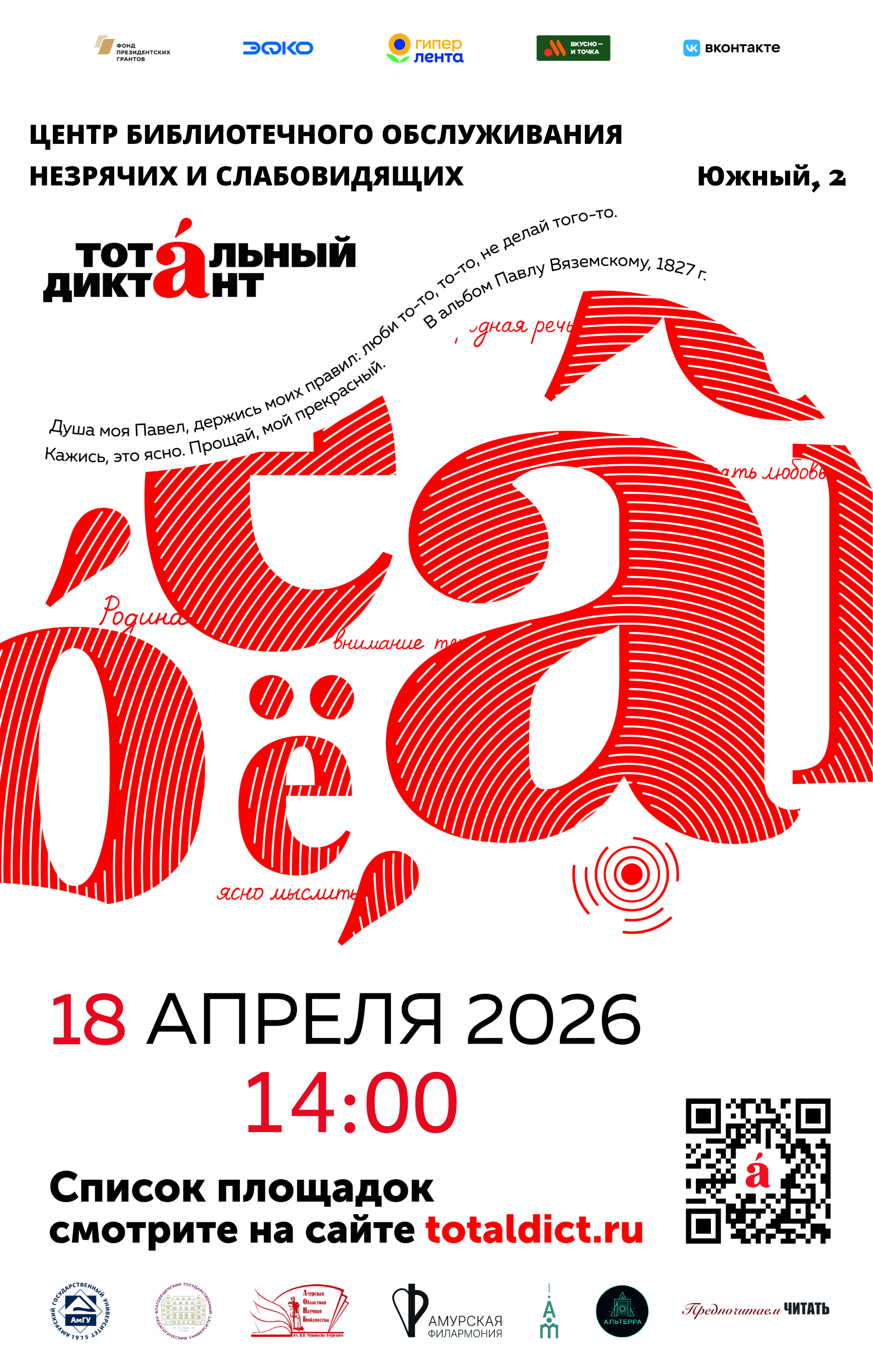 18 апреля Центр библиотечного обслуживания незрячих и слабовидящих (пер. Южный,2) станет площадкой «Тотального диктанта». «Тотальный диктант» – это ежегодная образовательная акция, объединяющая всех, кто любит русский язык, стремится проверить свои знания и поддерживать уровень грамотности.