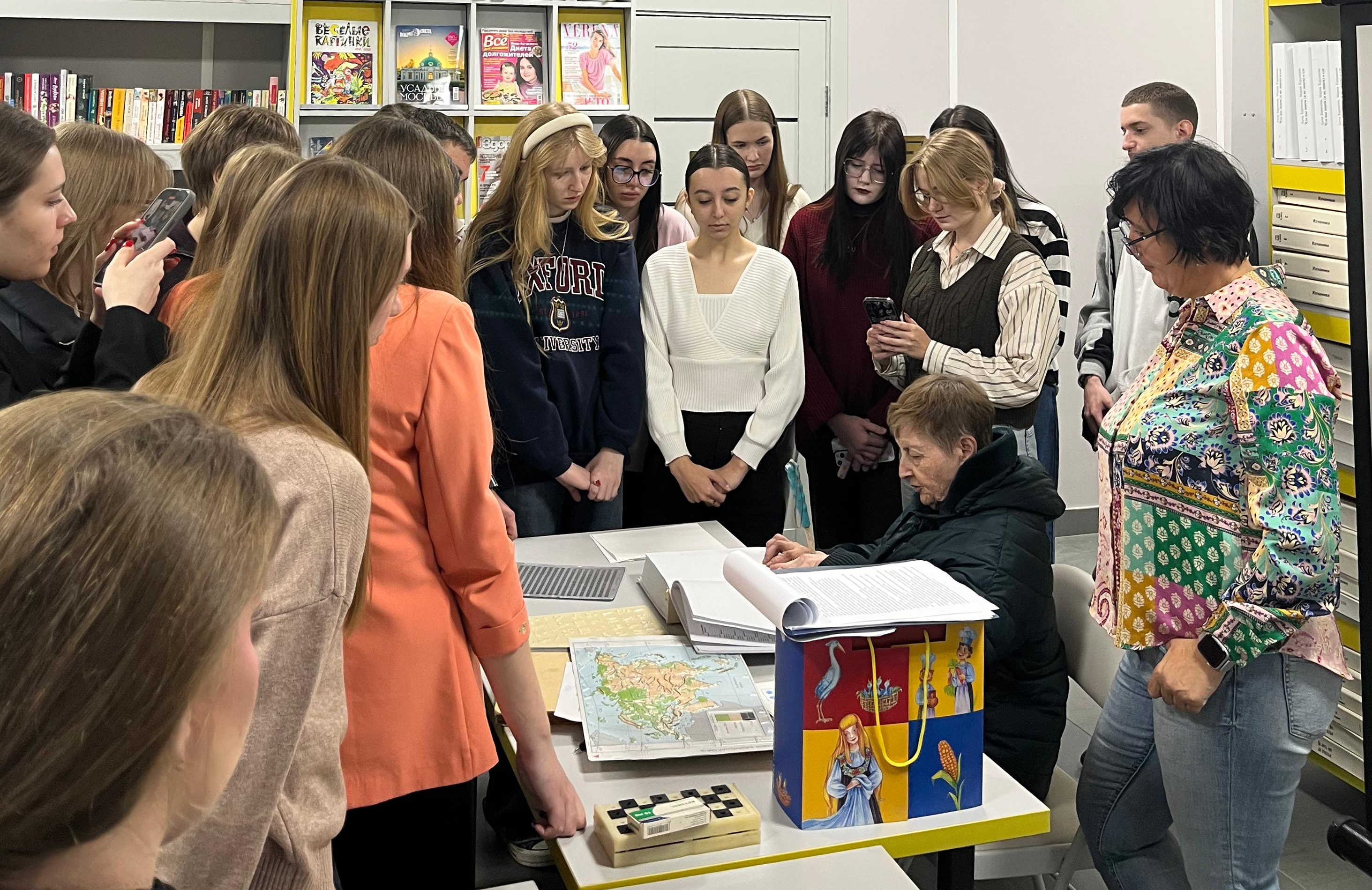 Экскурсия продолжилась знакомством с фондом библиотеки, состоящим из изданий специальных форматов для людей с нарушением зрения: книг рельефно-точечного шрифта и укрупнённого шрифта, книг с тактильными элементами, аудиокассет, флеш-карт, рельефно-графических пособий.
