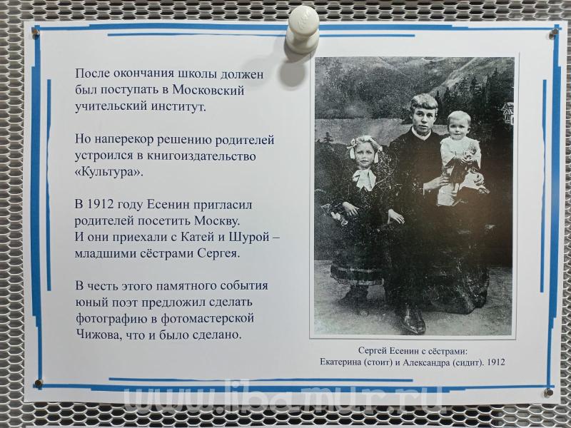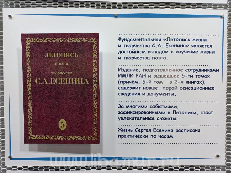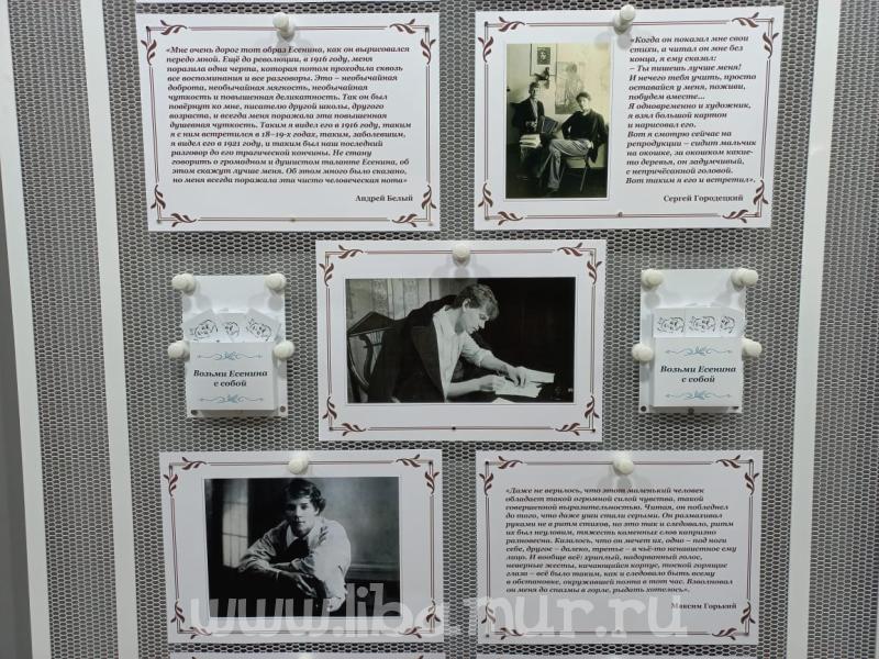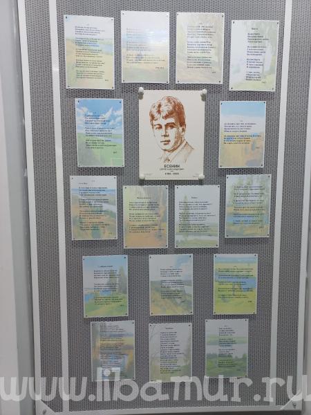 Экспозиция знакомит с интересными фактами биографии Сергея Есенина; предлагает подборку воспоминаний о нём; представляет книги из фондов Амурской областной научной библиотеки как самого поэта, так и о его жизни и творчестве. А ещё вы сможете пройти тест «Как там дальше?» и выяснить, насколько хорошо знаете стихотворения Сергея Есенина.