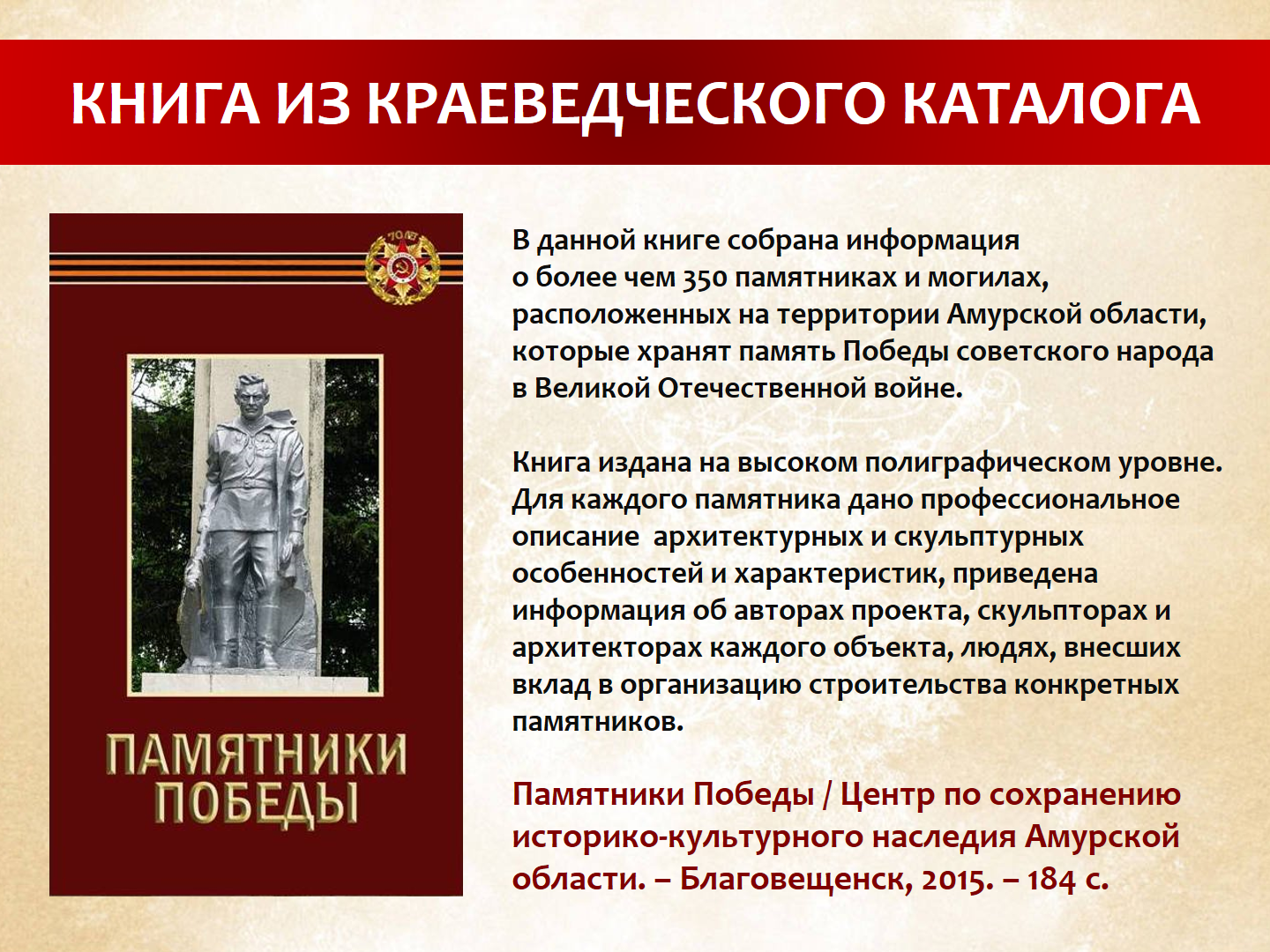 Ознакомиться с книгой «Памятники Победы» можно в отделе краеведения и редких книг главной библиотеки Приамурья.