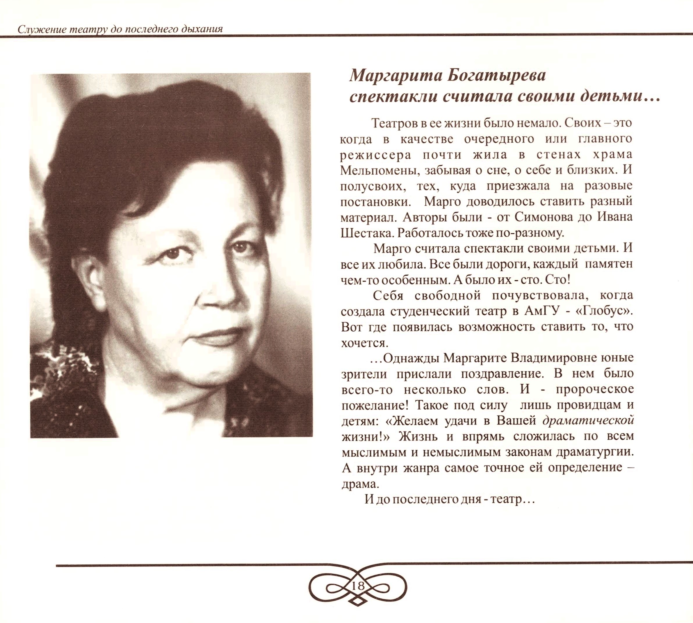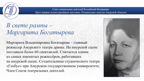 С именем Маргариты Богатырёвой связан звёздный период амурского театра. В 1983 году театр отправился на гастроли в Москву, подготовив 5 спектаклей. За это он был награждён орденом Трудового Красного Знамени.