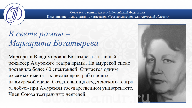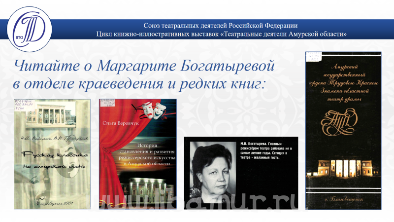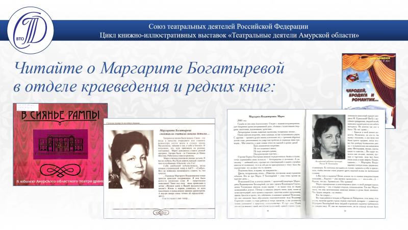 Друзья, мы продолжаем цикл выставок «Театральные деятели Амурской области», посвященный приближающемуся юбилею Союза театральных деятелей Российской Федерации (основан в 1876 году). Сегодняшняя публикация завершает цикл выставок о людях, которые сделали Амурский театр драмы таким, каким мы все его знаем и любим. Рассказываем о главном режиссере театра в 80-90-е гг. прошлого века – Маргарите Богатырёвой.