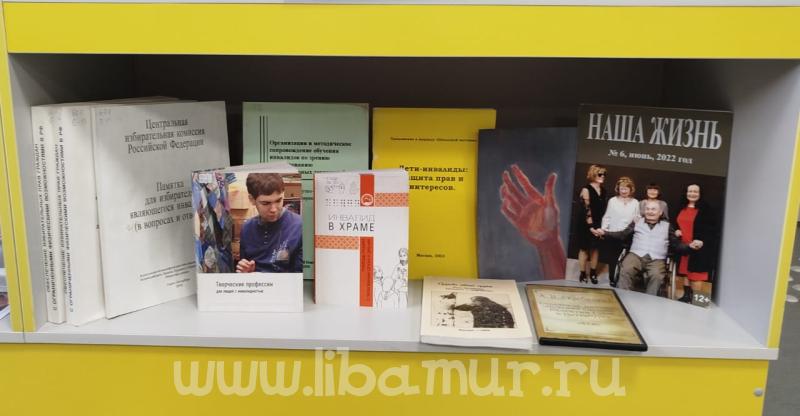 Для читателей с нарушением зрения на выставке представлена литература, напечатанная рельефно-точечным шрифтом – «Сборник практических рекомендаций по защите прав инвалидов», «Памятка для избирателя, являющегося инвалидом», «Обеспечение избирательных прав граждан с ОВЗ в РФ», «Дети инвалиды: защита прав и интересов».