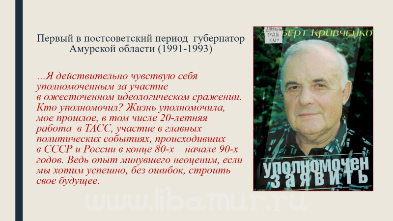 Альберт Аркадьевич Кривченко – серебряный медалист Благовещенской школы №1, студент Свердловского госуниверситета, водитель автобуса, журналист «Амурской правды», затем ТАСС, депутат Верховного Совета России, первый в постсоветский период губернатор Амурской области, член Союза российских писателей.