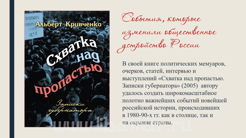 Главой администрации Амурской области был назначен в 1991 году и занимал эту должность до 1993 года. Именно на это время приходятся события, которые изменили общественное устройство России и о которых Кривченко рассказывает в своей книге политических мемуаров, очерков, статей, интервью и выступлений «Схватка над пропастью. Записки губернатора» (2005). Автору удалось создать широкомасштабное полотно важнейших событий новейшей российской истории, происходивших в 1980–90-х гг. как в столице, так и на окраине страны. Повествование насыщено любопытными фактами, многие их которых мало известны нынешнему читателю.