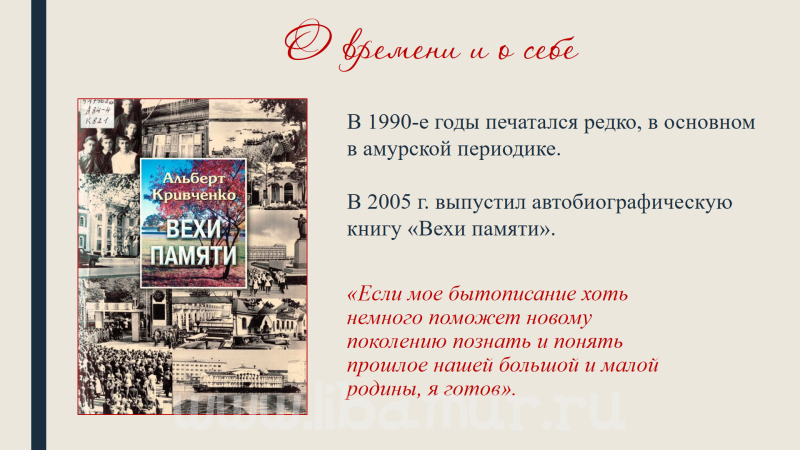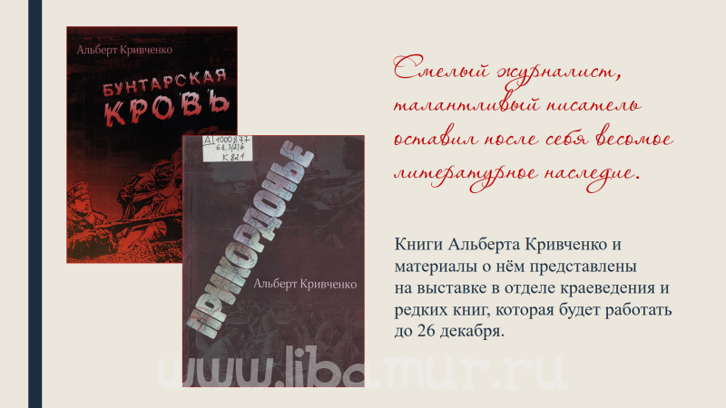Смелый журналист, талантливый писатель оставил после себя весомое литературное наследие. Книги Альберта Кривченко и материалы о нём представлены на выставке в отделе краеведения и редких книг, которая будет работать до 26 декабря.