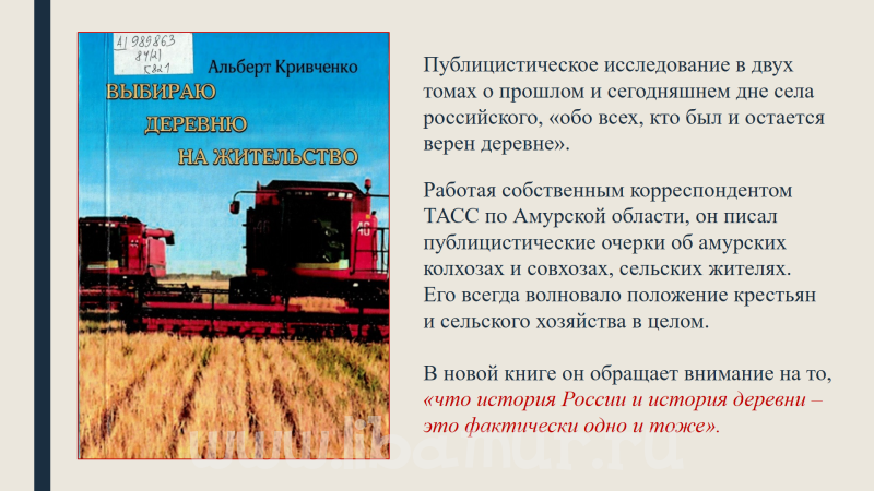 В 2015 году вышла знаковая книга Кривченко – аналитическая эпопея в двух томах «Выбираю деревню на жительство», над которой он работал 9 лет. Она посвящена истории российской деревни. За эту книгу Альберт Аркадьевич был удостоен Премии в области литературы и искусства Амурской области за 2016 год.