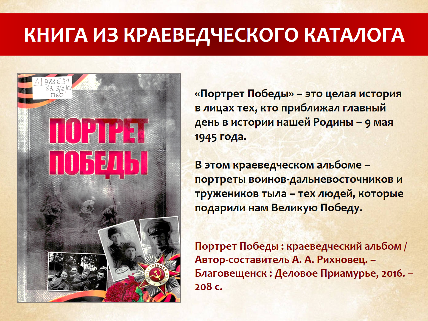 Краеведческий альбом «Портрет Победы» повествует нам о 175 героях-дальневосточниках, рассказывает о них устами тех, кто помнит, кто знал и знает героев лично, устами родных и близких, друзей и знакомых.