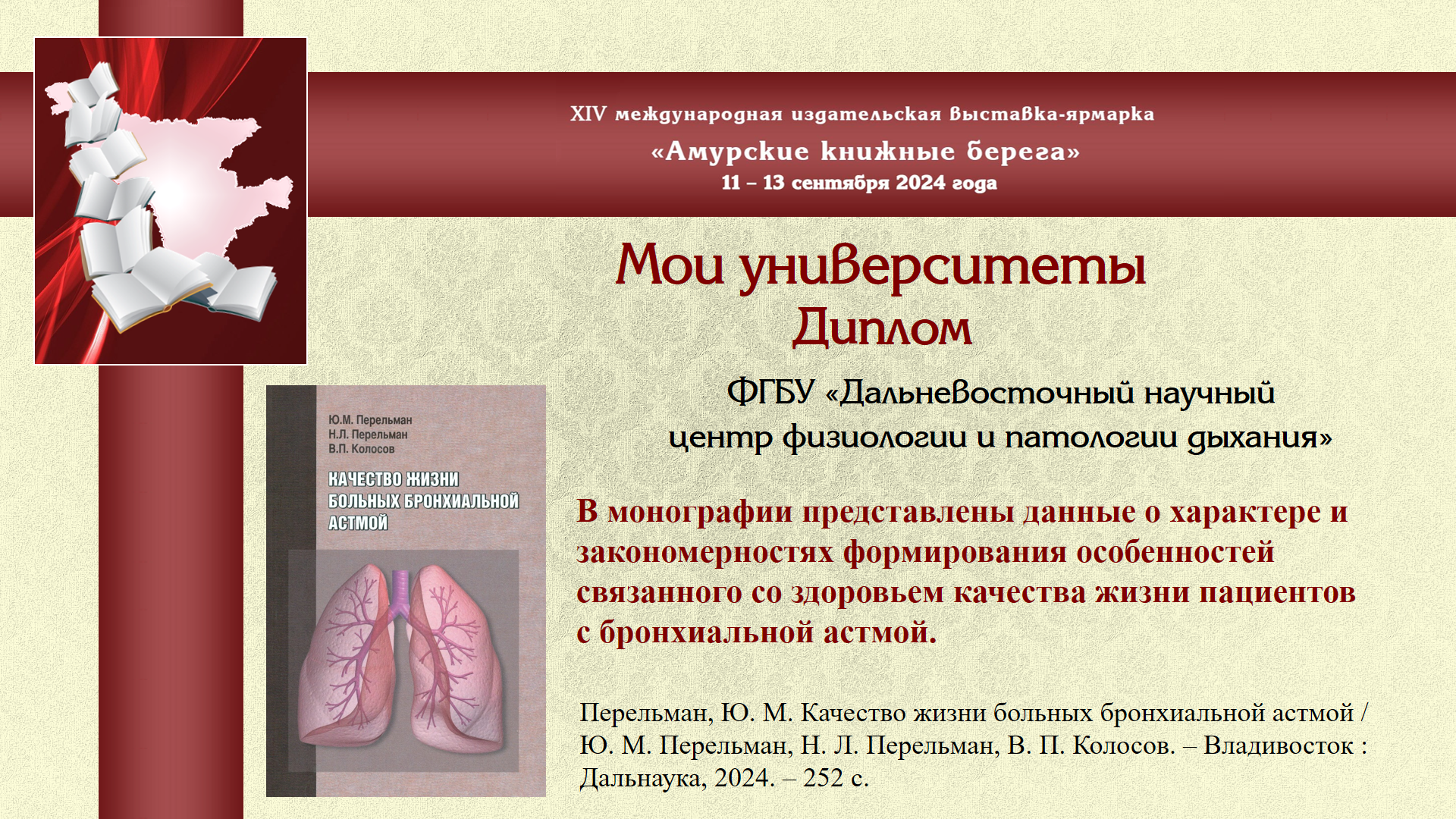 Мы знакомим вас с участниками, экспонатами и победителями XIV международной выставки «Амурские книжные берега» (Благовещенск, 13-15 сентября 2024 г.). Диплом в номинации «Мои университеты» присужден ФГБУ «Дальневосточный научный центр физиологии и патологии дыхания» за монографию «Качество жизни больных бронхиальной астмой».