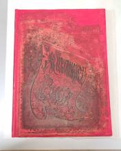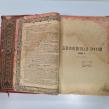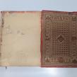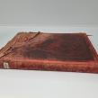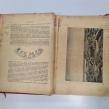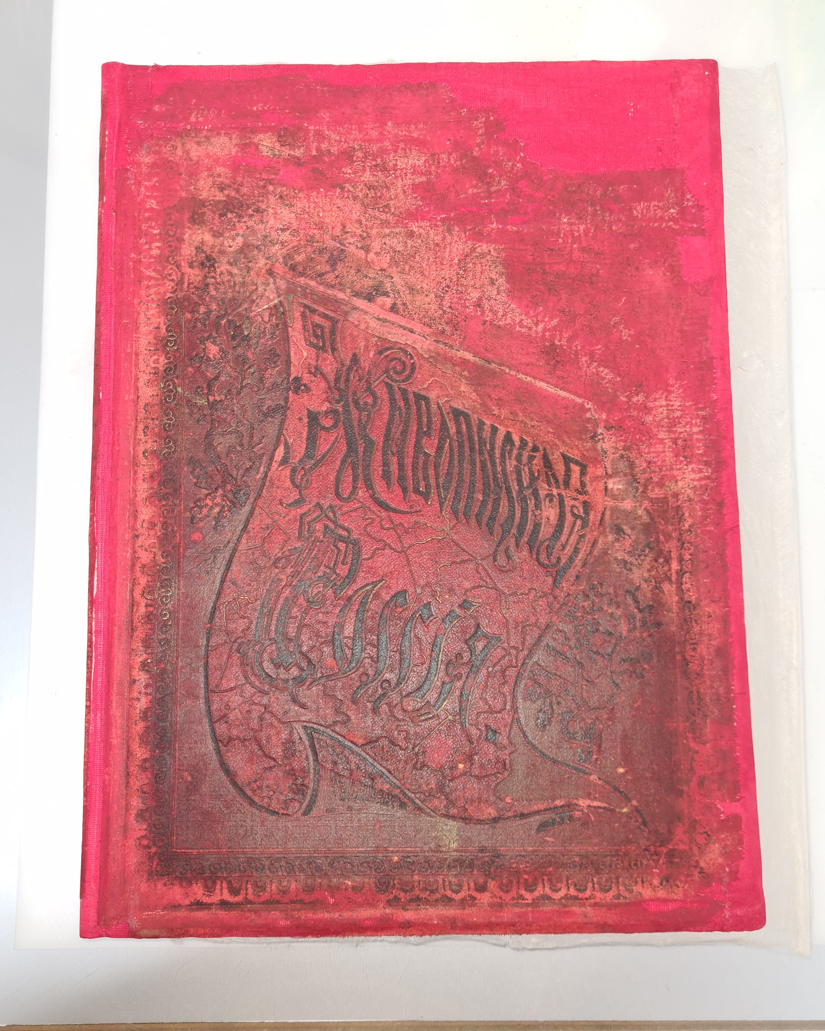 И вот листы отремонтированы, блок прошит, картон сторонок переплёта укреплён, восполнены и затонированы места утрат коленкорового покрытия. Но, к сожалению, нет возможности восстановить тиснение и рисунок на переплёте.