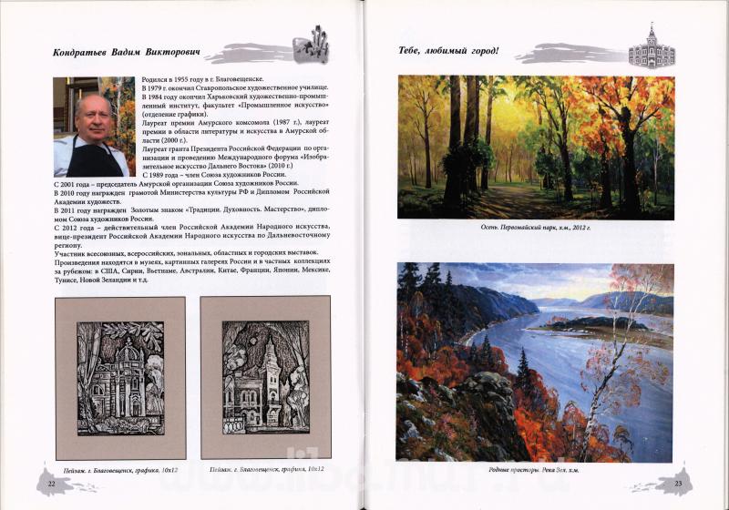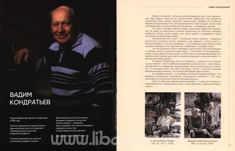 На выставке «Ловец настроений» мы представляем не только художественные альбомы Вадима Кондратьева «Живопись» (2010), «На родной земле» (2014), «Под небом Родины моей» (2019) и коллективные сборники работ амурских художников, но и книги амурских авторов, которые он проиллюстрировал. Художник оформил книгу для детей Нины Дьяковой «Что у солнца на затылке», проиллюстрировал книжку-раскраску «Веселая азбука» и поэтические сборники Светланы Борзуновой, Олега Маслова и др.