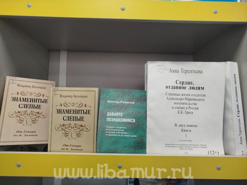 Выставка познакомит с изданиями, рассказывающими о жизни и деятельности знаменитых незрячих ученых, поэтов, писателей и изобретателей, которые, несмотря на серьезные трудности, смогли добиться больших успехов. Так, В. Бухтияров в двухтомном издании «Знаменитые слепые» прослеживает судьбы неординарных людей, лишённых зрения, от древности до современности: Луи Брайля, создателя системы чтения и письма для незрячих; шведского изобретателя, лауреата Нобелевской премии по физике Нильса Густава Далена; Гомера; Александра Лапшина и других.
