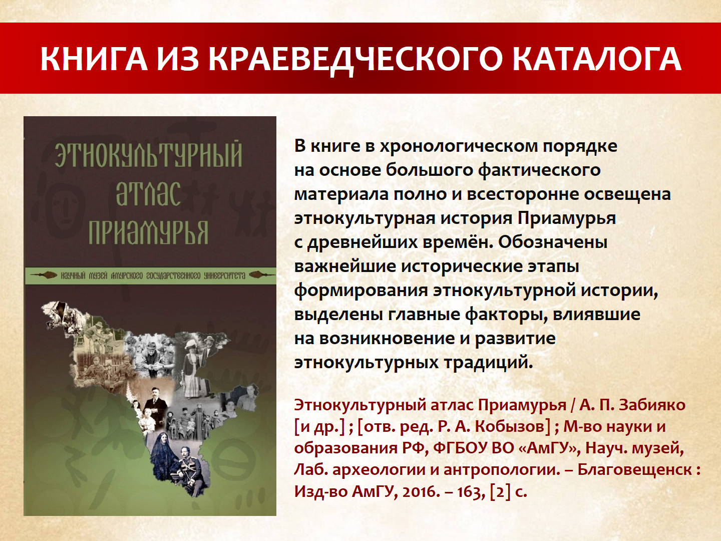 Сегодня представляем вам «Этнокультурный атлас Приамурья». В книге в хронологическом порядке на основе большого фактического материала полно и всесторонне освещена этнокультурная история Приамурья с древнейших времён. В книге обозначены важнейшие исторические этапы формирования этнокультурной истории, выделены главные факторы, влиявшие на возникновение и развитие этнокультурных традиций. Значительная часть фактического материала была собрана авторами в ходе полевых исследований. Эти материалы хранятся в фондах Научного музея Амурского государственного университета. Иллюстрации знакомят читателя с историческими объектами, хранящимися в фондах Научного музея АмГУ, а также в коллекциях других научных и музейных учреждений. Обилие систематически построенного иллюстративного материала позволяют назвать книгу атласом.