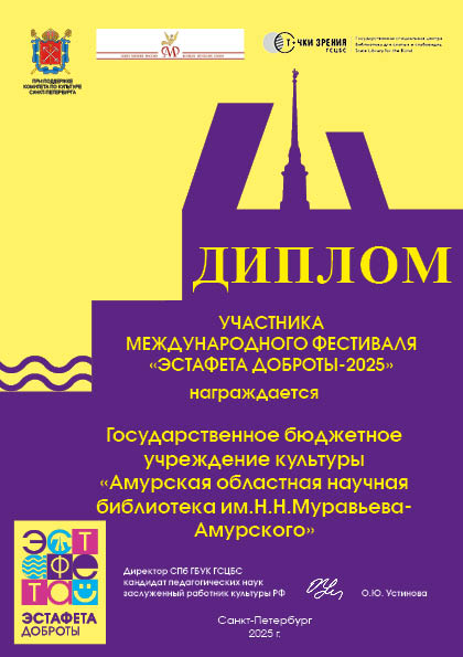 Амурская областная научная библиотека им. Н.Н. Муравьева-Амурского награждена дипломом участника Международного фестиваля «Эстафета доброты – 2025».