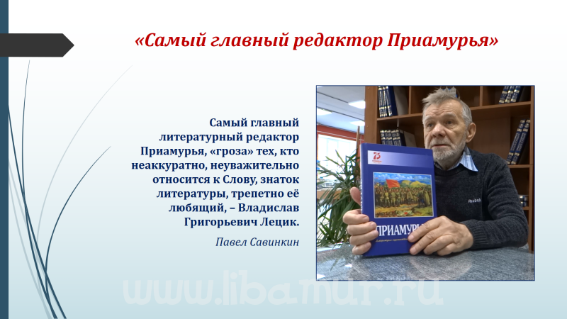 Владислав Лецик – высококлассный литературный редактор, благодаря которому за последние три десятилетия в Приамурье вышли сотни профессионально подготовленных к печати книг разных жанров. Среди них выделяется литературный альманах «Приамурье».