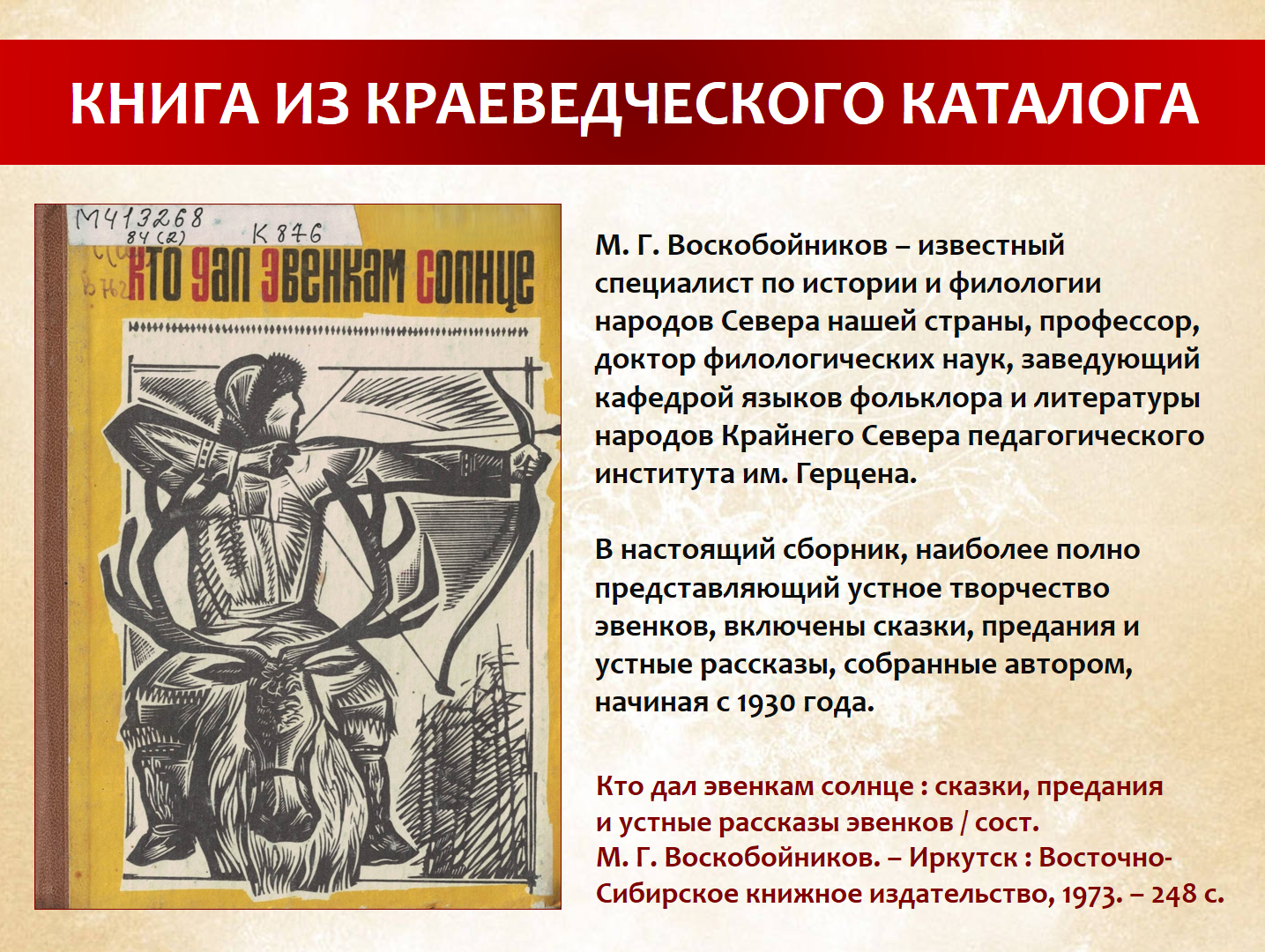 Ознакомиться с книгой «Кто дал эвенкам солнце» можно в отделе краеведения и редких книг главной библиотеки Приамурья.
