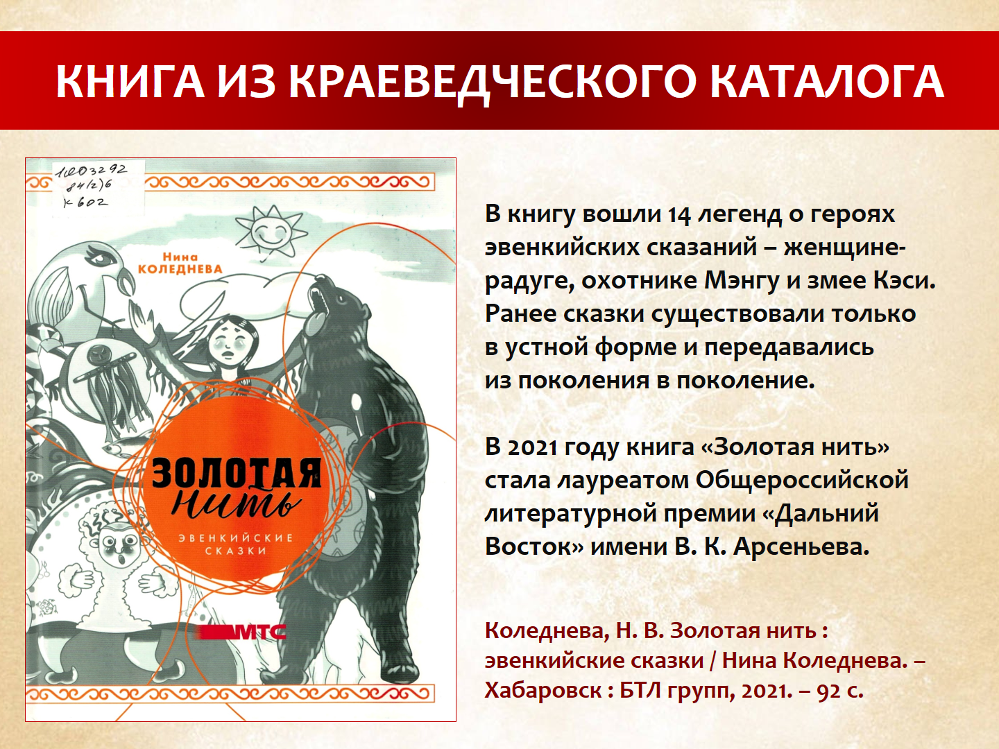 Книга эвенкийских сказок «Золотая нить» Нины Коледневой – это собрание из 14 авторских сюжетов о женщине-радуге, охотнике Мэнгу и змее Кэси, которые написаны по мотивам мифов и легенд, услышанных писателем в разные годы в национальных общинах. Перевод сказок на эвенкийский язык взяли на себя жители села Тугур Хабаровского края, а иллюстрациями занимались юные художники Забайкалья и Хабаровского края. Помогла собрать и издать эвенкийские легенды, сделав их доступными для всех желающих не только в печатном, но и в аудиоформате на русском и эвенкийском языках компания МТС.