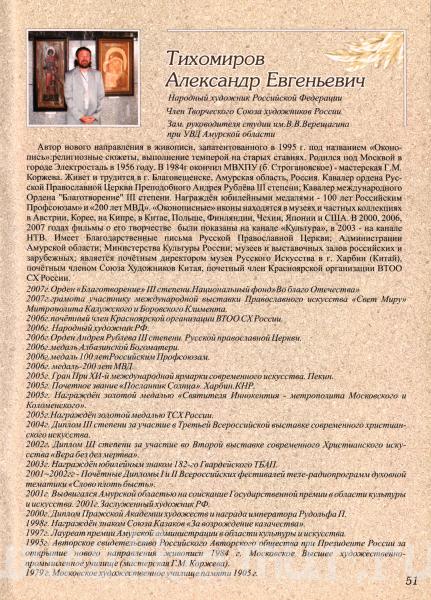 Александр Тихомиров был заместителем руководителя студии художников им. В. В. Верещагина при УВД Амурской области. Об этой странице его биографии узнавайте из «Каталога новых и ретроспективных произведений» (2007) студии.