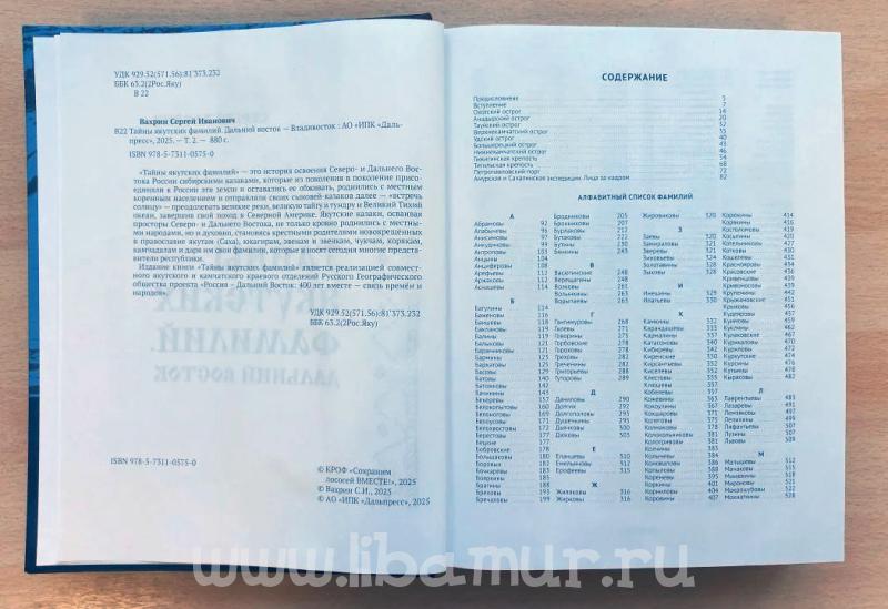 Друзья, камчатский писатель и краевед Сергей Вахрин передал в фонд Амурской областной научной библиотеки свою новую книгу «Тайны якутских фамилий. Дальний Восток» (2025). Описывая историю возникновения казачьих фамилий на Дальнем Востоке, автор почти на 900-х страницах отслеживает их корни, что тянутся из времен освоения Восточной Сибири в XVII веке.