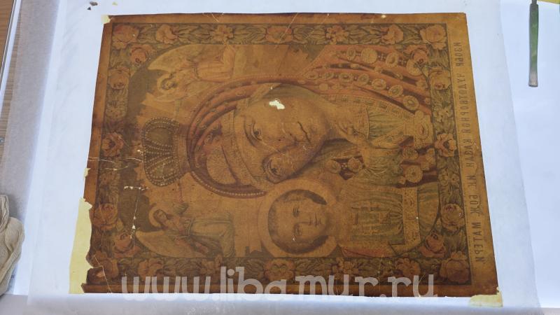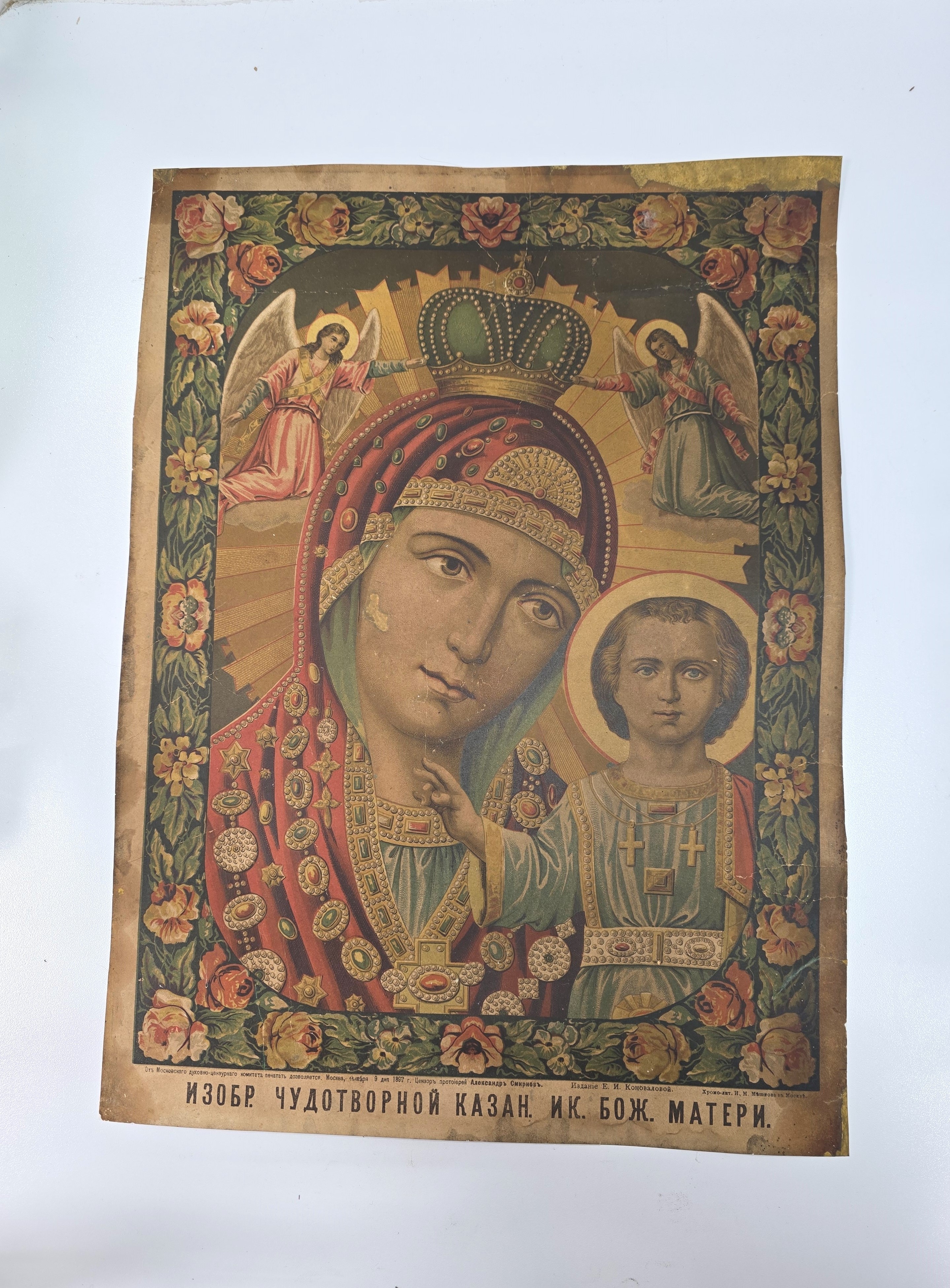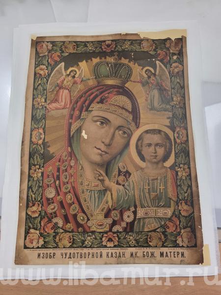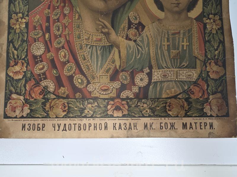 Это была бумажная икона под названием «ИЗОБР. ЧУДОТВОРНОЙ КАЗАН. ИК. БОЖ. МАТЕРИ». Далее надпись гласит, что что «от Московского духовно-цензурного комитета печать дозволяется. Москва, января 9 дня 1897 г. Цензор протоирей Александр Смирнов. Издание Е.И. Коноваловой. Хромо-лит. И.М. Машкова в Москве».