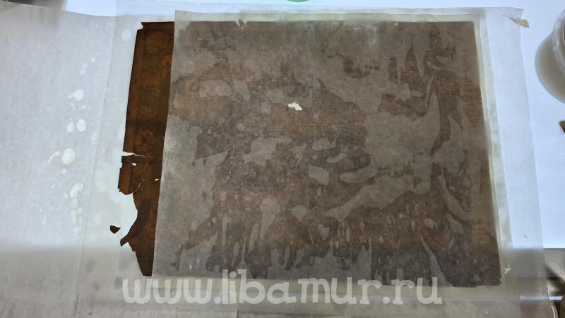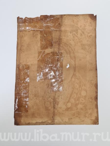 Икона за свое бытование покрылась копотью от лампад и свечей, разрывы были заклеены скотчем (а это враг злейший бумаги!), присутствовали утраты, ну и конечно, следы жизнедеятельности насекомых.