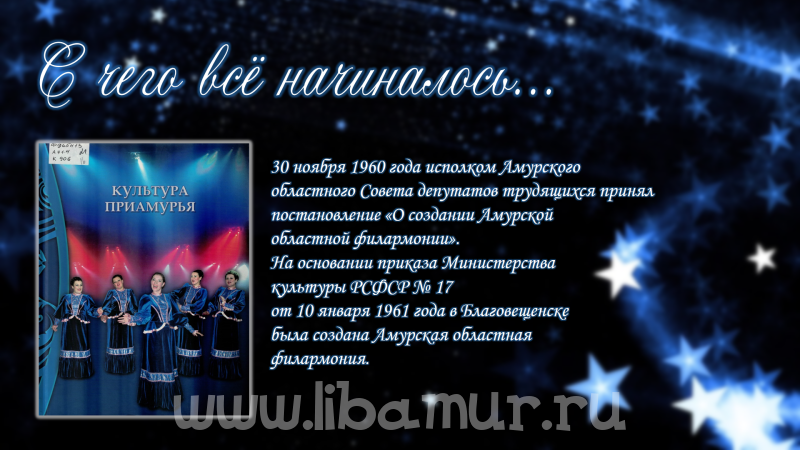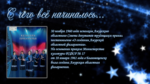 В конце ноября 1960 года Амурский Совет депутатов принял решение о создании Амурской областной филармонии. Однако свой день рождения культурное учреждение отмечает в другую дату – в день первого концерта, который состоялся 12 апреля 1961 года.