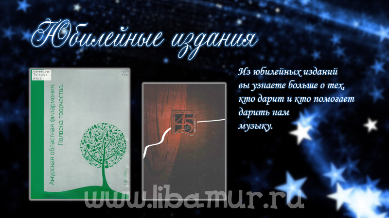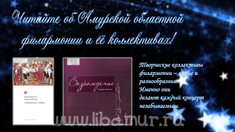 К юбилейному дню рождения Амурской областной филармонии в отделе краеведения и редких книг подготовлена книжная выставка «Дом, в котором живёт музыка». На выставке – юбилейные издания филармонии и книги о творческих коллективах, входящих в ее состав. Дополняют выставку статьи из газеты «Амурская правда», которые доступны в библиотеке и онлайн: