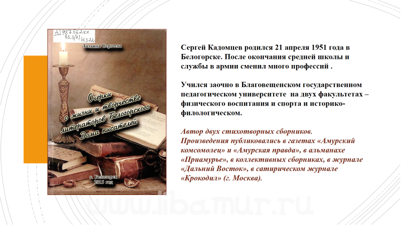 Выставку, посвящённую 75-летию со дня рождения поэта, члена Союза писателей России Сергея Ивановича Кадомцева (1951–2014), подготовили в отделе краеведения и редких книг.