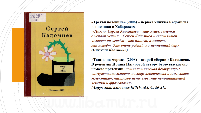«Танцы на морозе» (2008) – второй сборник Кадомцева, вышедший в Белогорске и получивший отзывы в амурской периодике. В рецензии И. Назаровой автору было высказано немало претензий: «стилистическая безвкусица»; «нечувствительность к слову, лексическая и смысловая эклектика»; «широкое использование ненормативной лексики и фразеологии»...