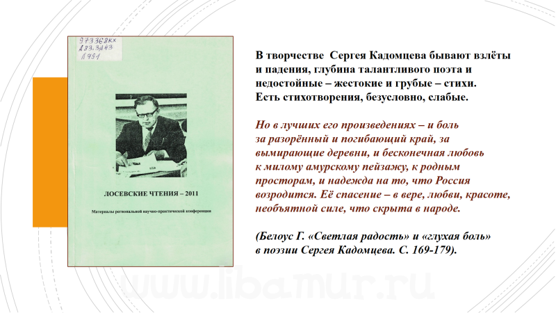 «Но в лучших его произведениях – и боль за разорённый и погибающий край, за вымирающие деревни, и бесконечная любовь к милому амурскому пейзажу, к родным просторам, и надежда на то, что Россия возродится. Её спасение – в вере, любви, красоте, необъятной силе, что скрыта в народе» (Г. А. Белоус, учитель МОУ СОШ №200 г. Белогорска).