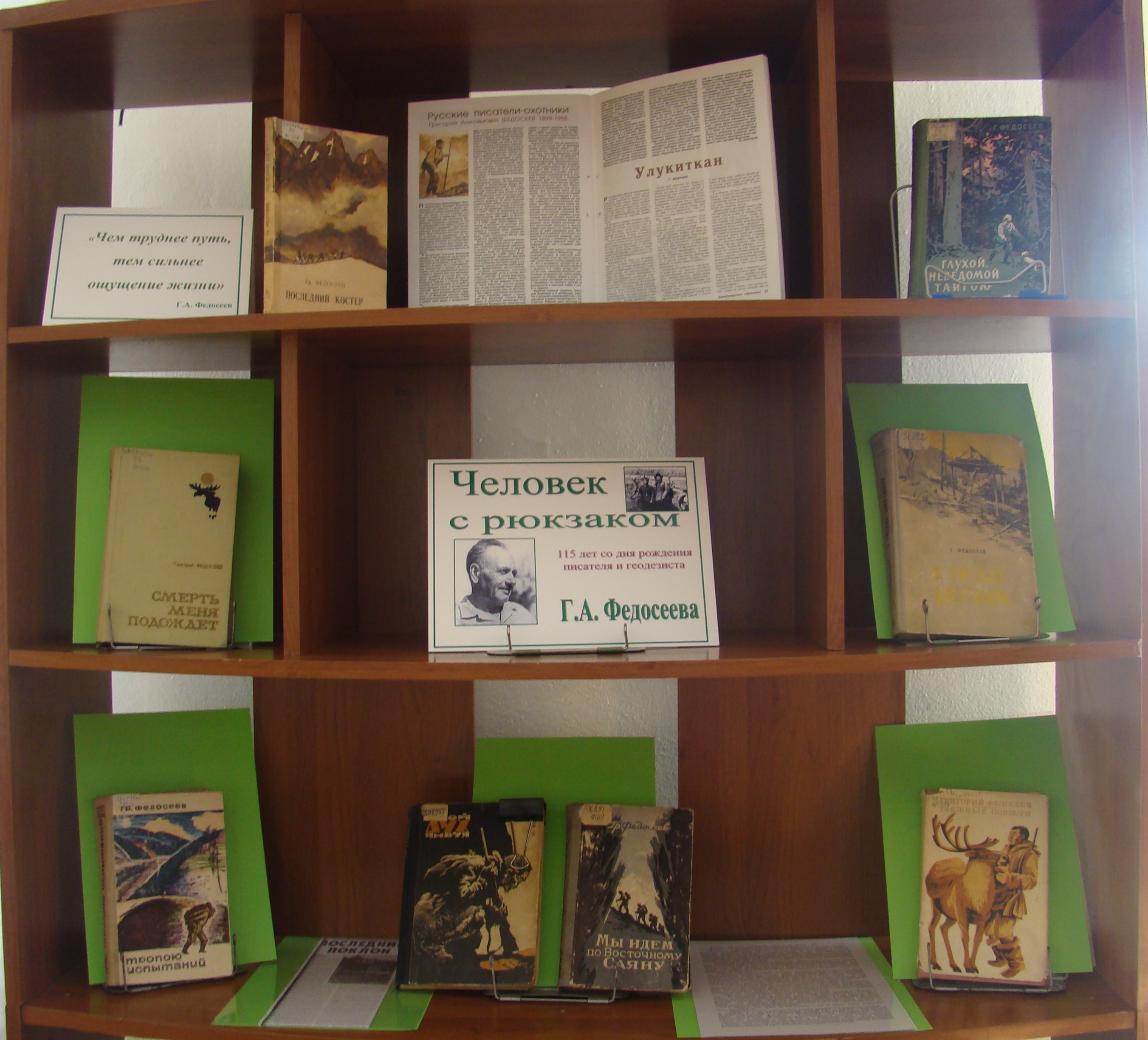 10 января в отделе краеведения и редких книг открылась книжная выставка «Человек с рюкзаком», посвящённая 115-летию со дня рождения писателя и геодезиста Г. А. Федосеева.