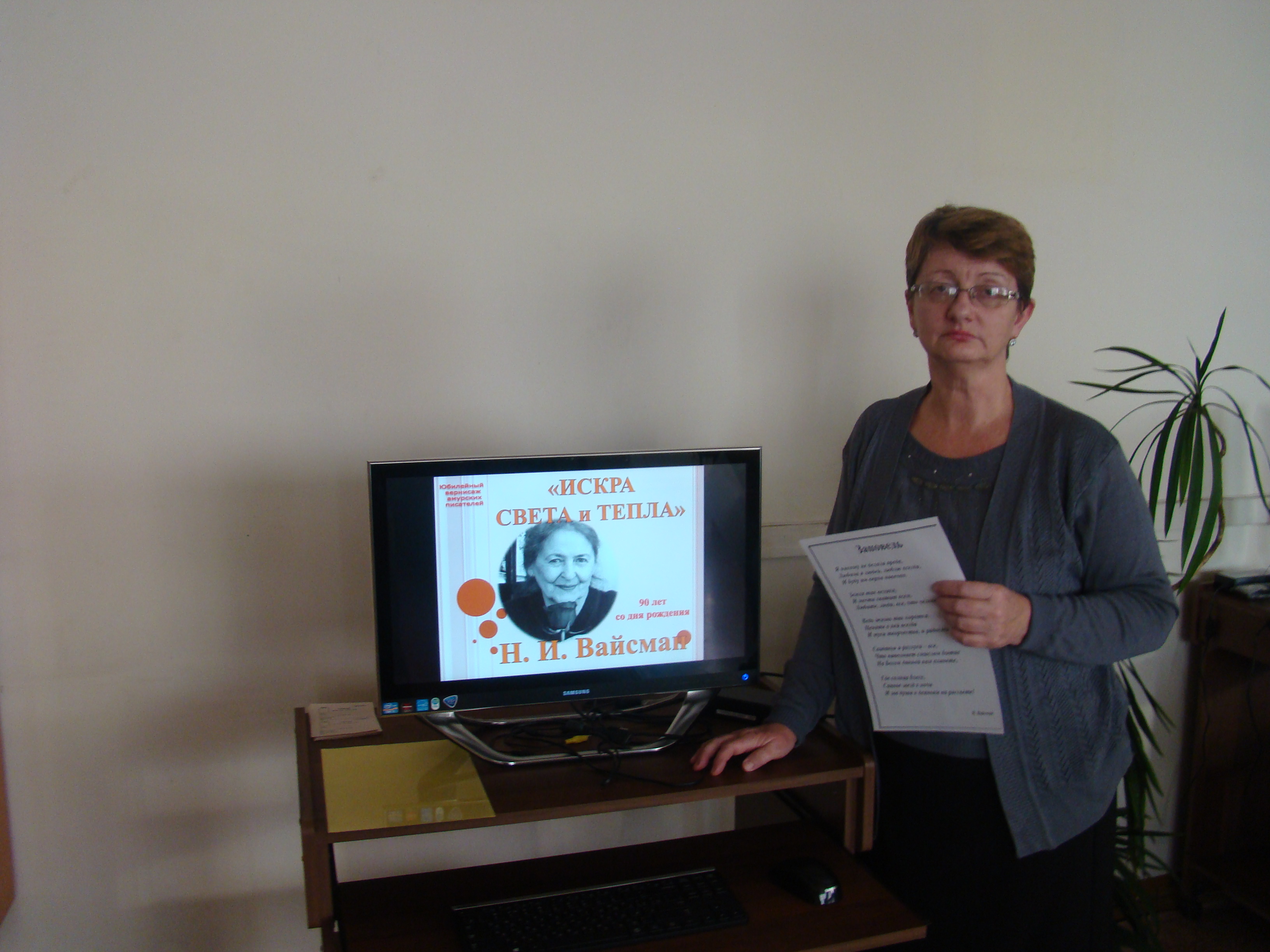 На этом же занятии Марина Чеснокова, заведующая отделом краеведения и редких книг, продолжая начатую традицию, познакомила мастериц с интересными изданиями с выставки «Искра света и тепла», посвященную Анне Вайсман. Информация так заинтересовала посетителей, что многие из них захотели поближе узнать творчество нашей знаменитой землячки.