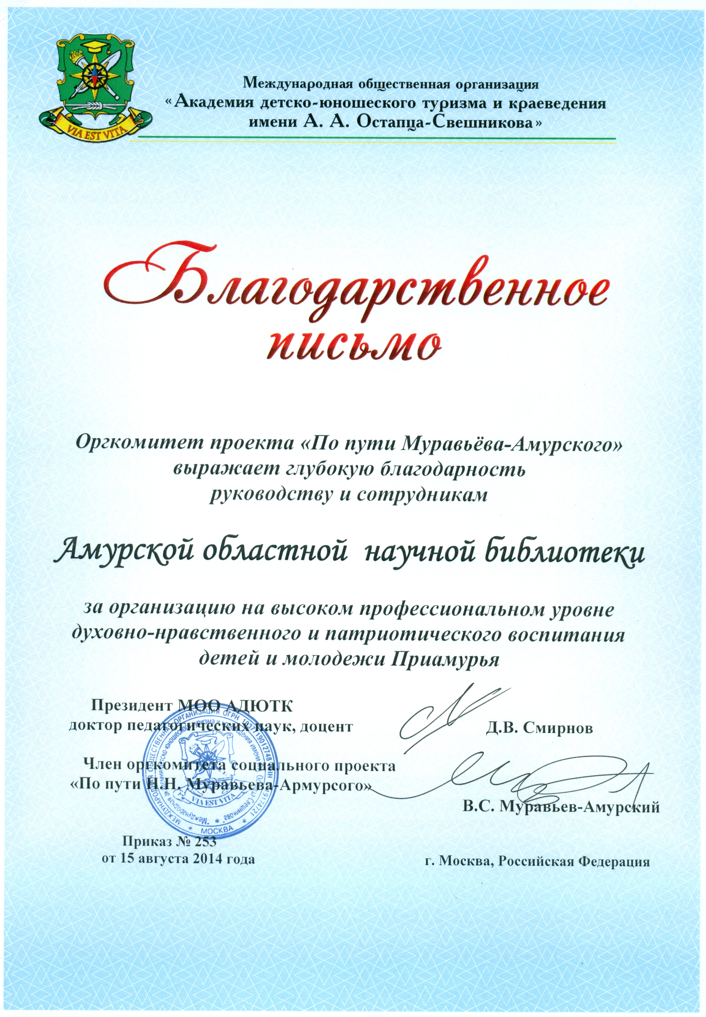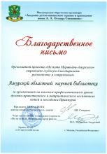 На днях областная научная библиотека получила Благодарственное письмо из Москвы от Международной общественной организации «Академия детско-юношеского туризма и краеведения им. А.А. Остапца-Свешникова» в лице оргкомитета проекта «По пути Муравьёва-Амурского» «за организацию на высоком профессиональном уровне духовно-нравственного и патриотического воспитания детей и молодёжи Приамурья».
