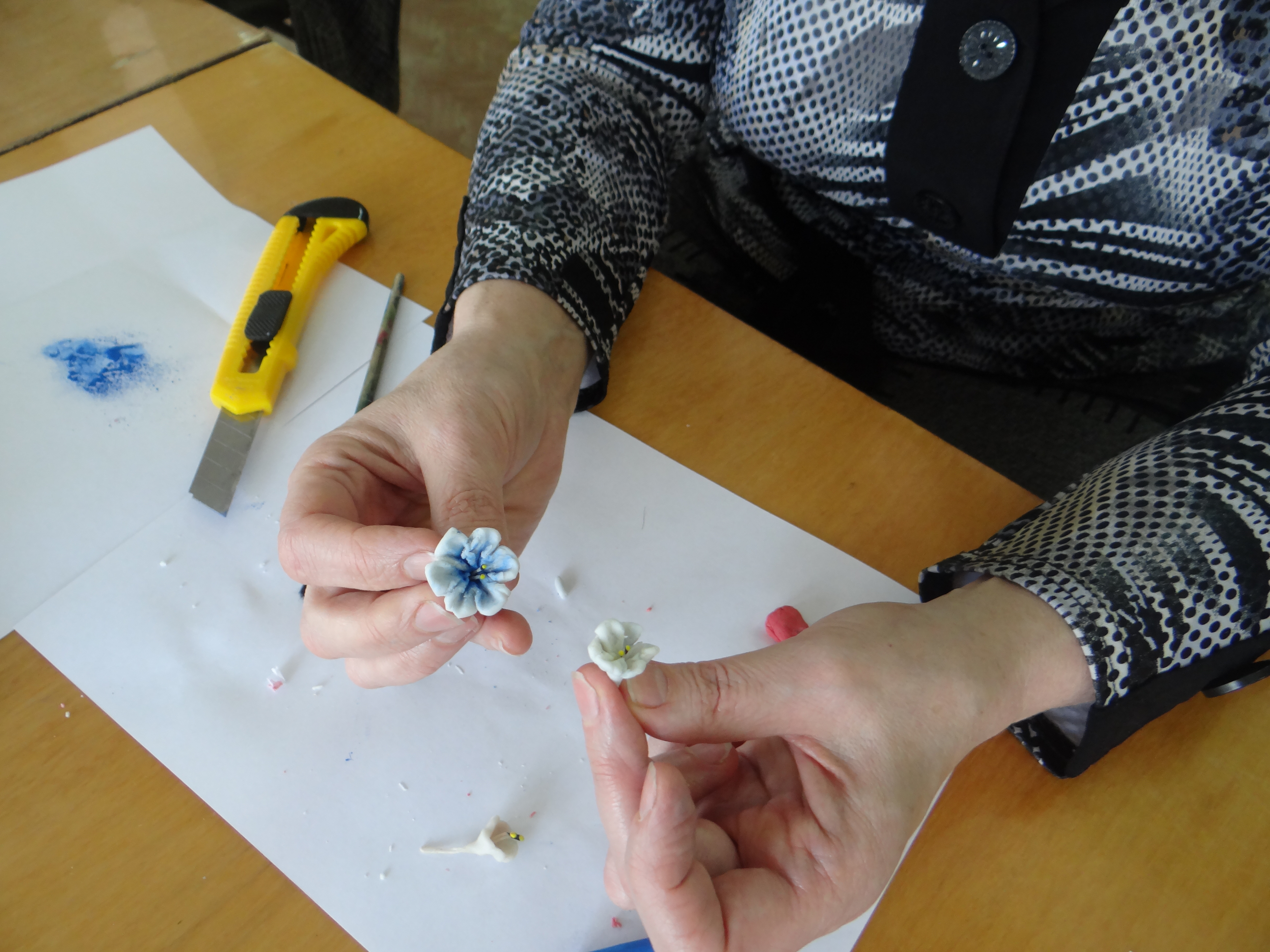 Исходный материал – белый, пластичный, теплый, послушный «холодный фарфор» – позволяет воплотить в реальность любую задумку. Впервые взяв его в руки, рукодельницы освоили технологию изготовления цветка, раскрасили его каждая на свой вкус. Заоконный снежный пейзаж оживился ярким букетом.