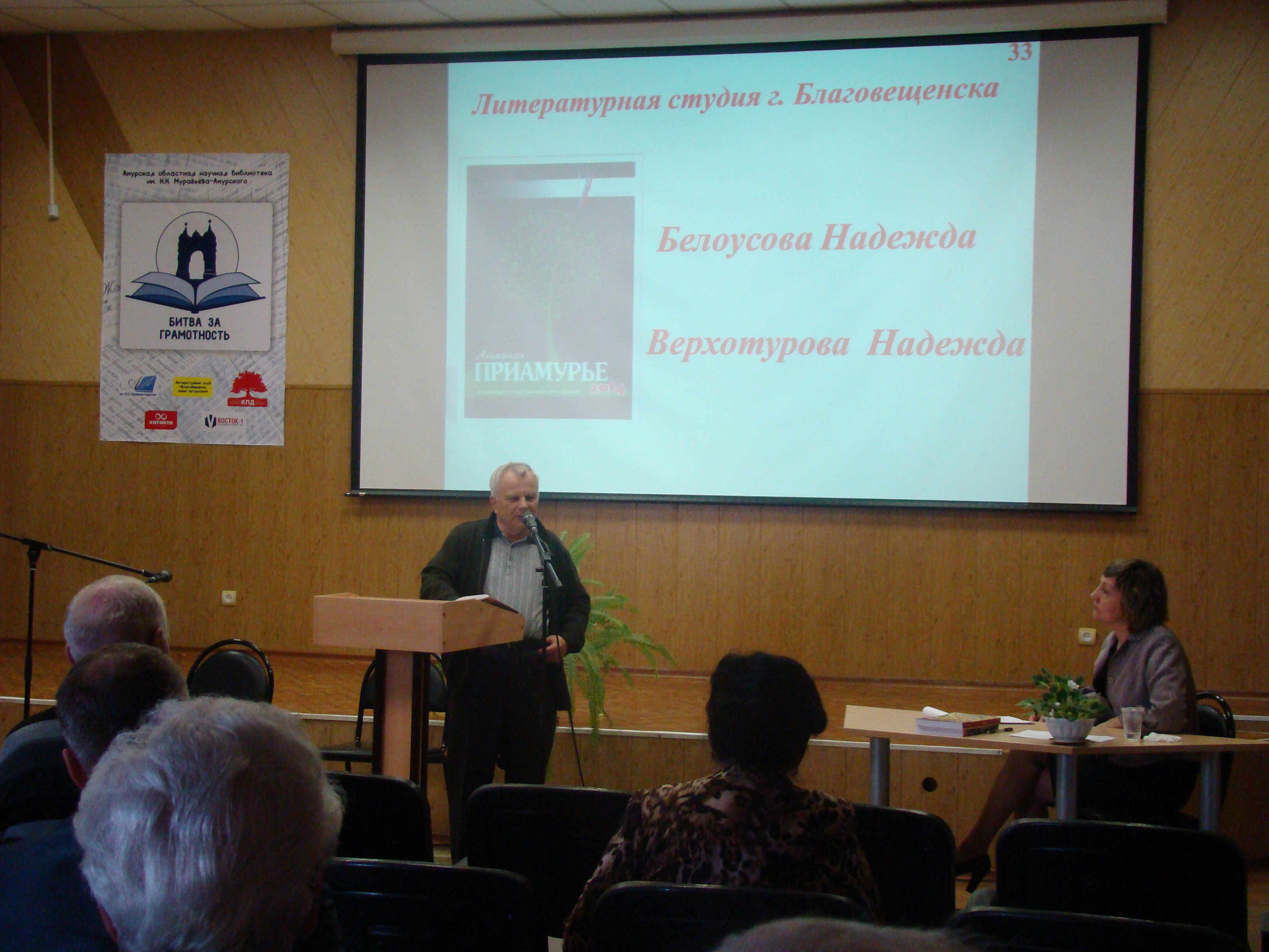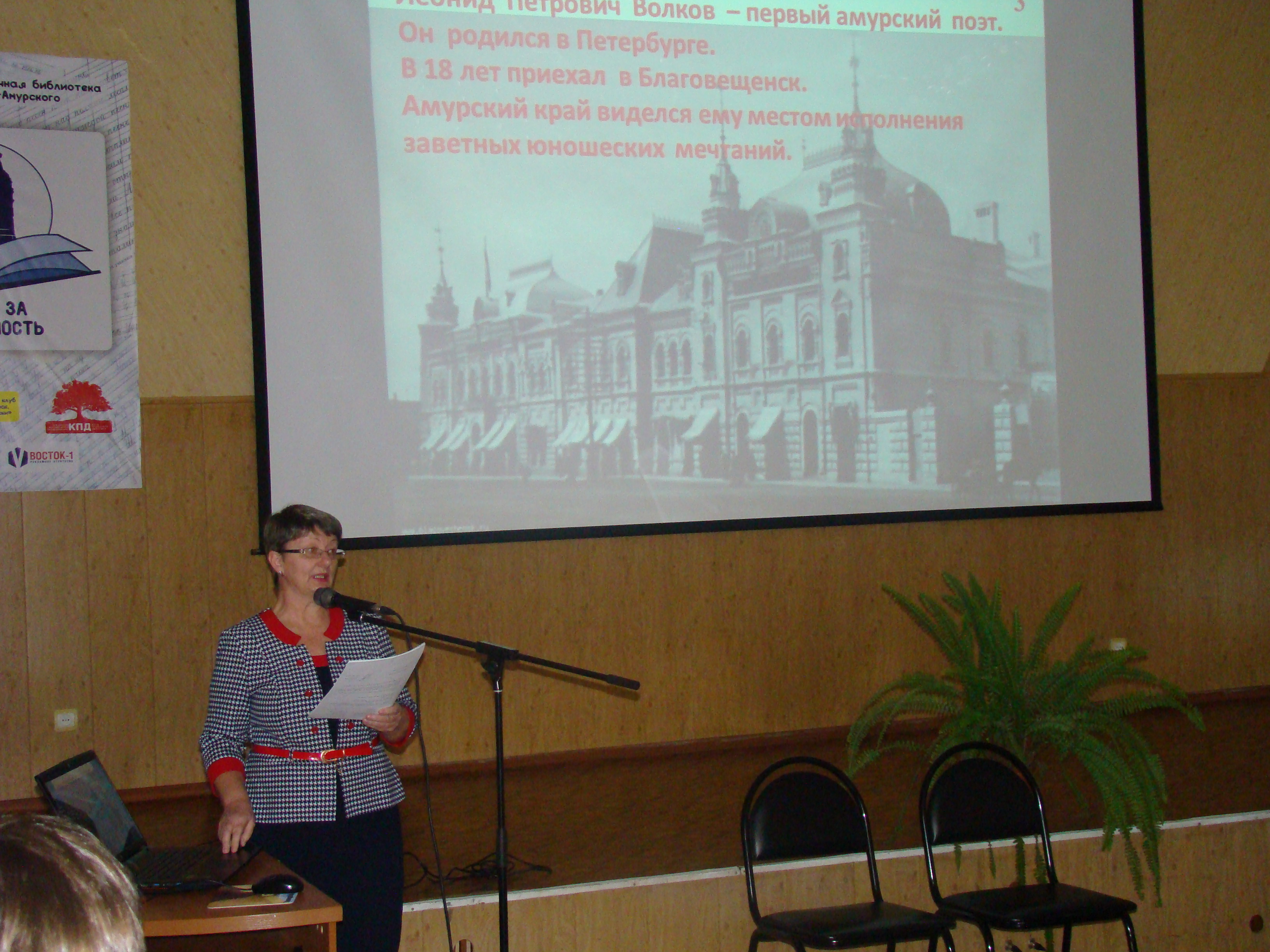 2015 год богат юбилеями  наших амурских поэтов Леонида Волкова,  Станислава  Повного,  Виктора Алюшина. 75-летие отмечают в этом году Олег Головко  и Ли ЯнЛин,  65-летие – Павел Никиткин, 55-летие – Константин Воронов.  Посвященную этим датам мультимедийную презентацию  «Юбилейный вернисаж» представила заведующий отделом краеведения и редких книг Марина Чеснокова. На Странице памяти вспомнили всех ушедших амурских поэтов: Светлану Борзунову, Нехаму Вайсман, Тамару Шульга и многих других.