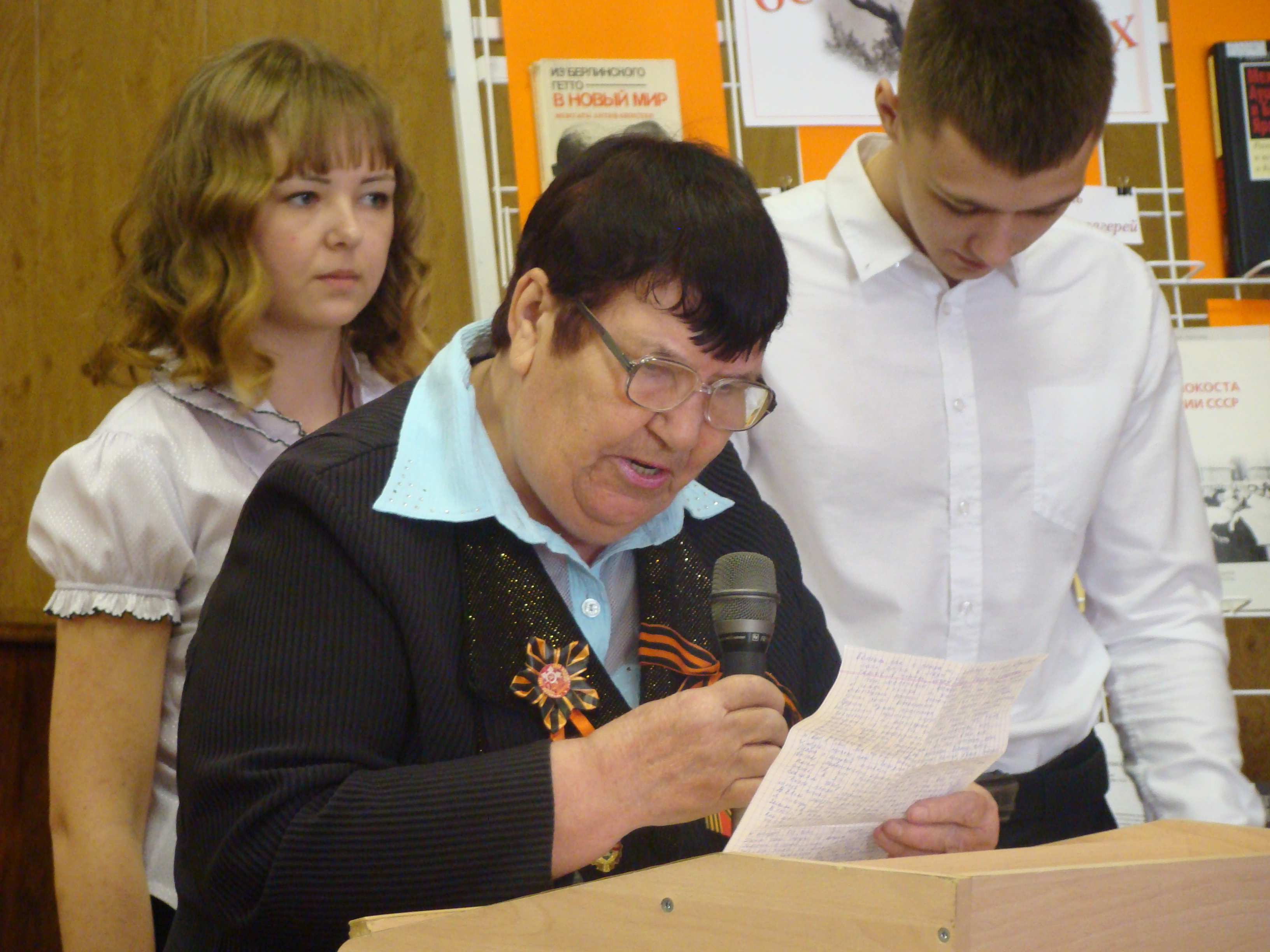 Фрагмент фильма "Обыкновенный фашизм" напомнил участникам встречи о тех страшных годах. Те, кто пережил их наяву – не забудут никогда. Те, кто знает о них только по книгам и рассказам получили впечатления от непосредственных участников событий. Евдокия Васильевна Аксенова своими личными воспоминаниями приоткрыла страничку лихолетья.