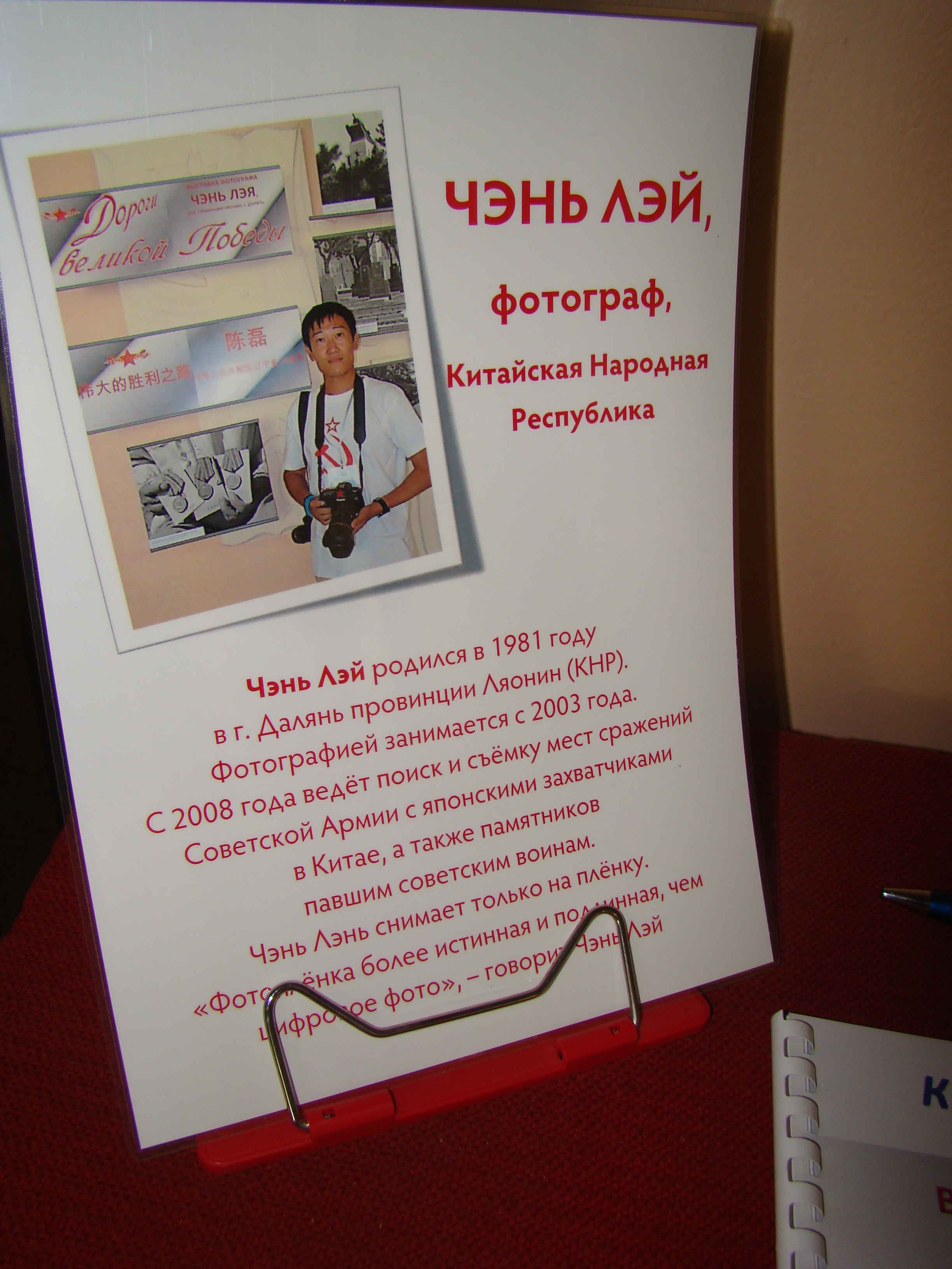 Фотовыставка китайского фотографа Чэнь Лэя «Дороги великой Победы», посвящена 70-летию окончания Второй мировой войны. «Мои родные обязаны жизнью советским солдатам», – рассказал Чэнь Лэй.