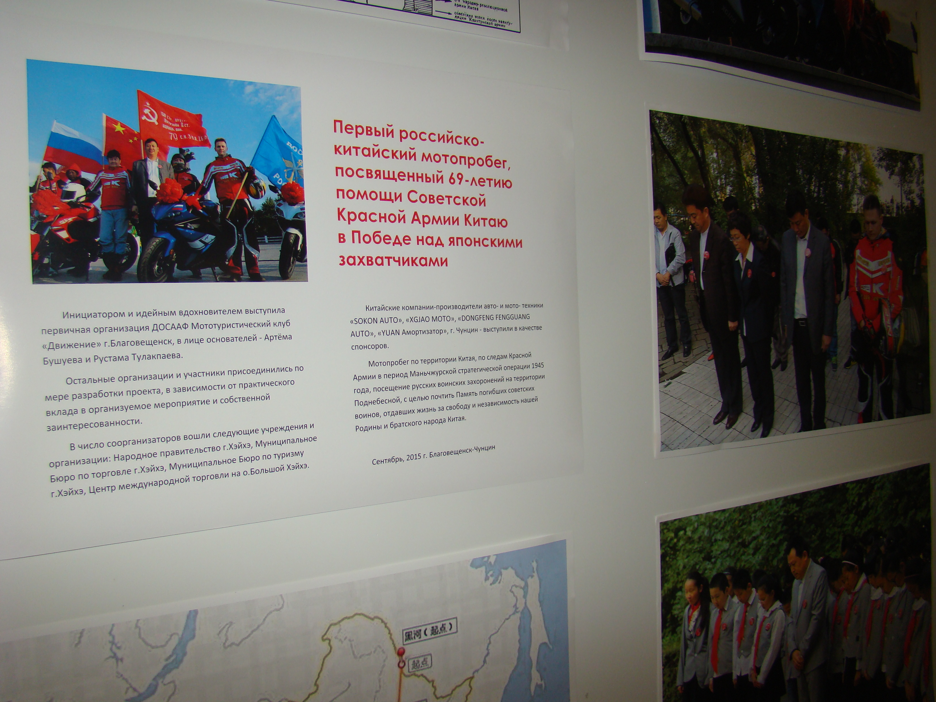 15 августа в рамках российско-китайской ярмарки культуры и искусства в библиотеке состоялась презентация второго российско-китайского мотопробега в честь окончания Второй мировой войны и открытие фотовыставки китайского фотографа Чэнь Лэя «Дороги великой Победы»,