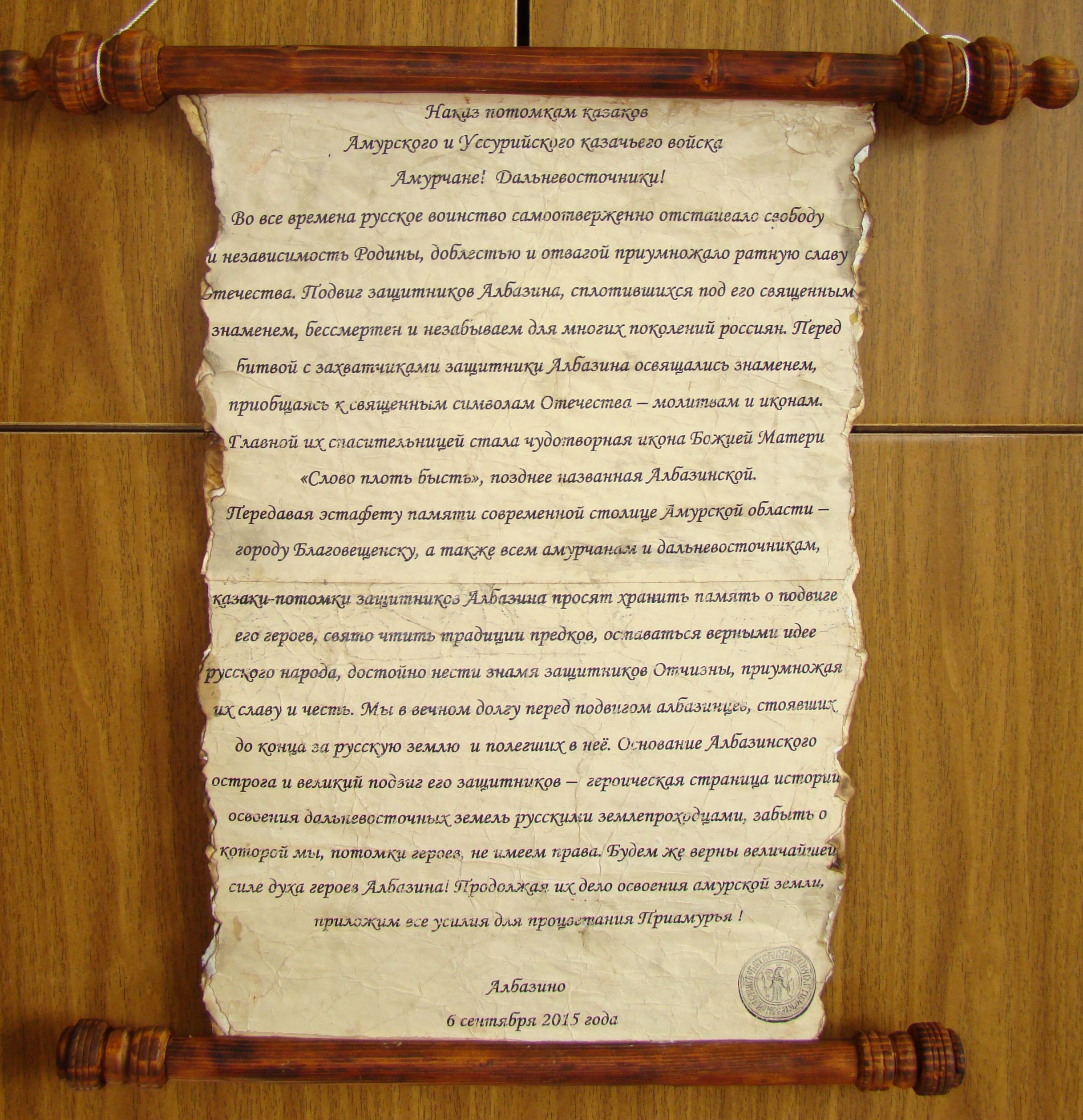 Албазинский наказ станет залогом продолжения и укрепления традиций православной веры, гражданского патриотизма и воинской доблести амурчан в свершениях потомков героев Албазина и их современников.