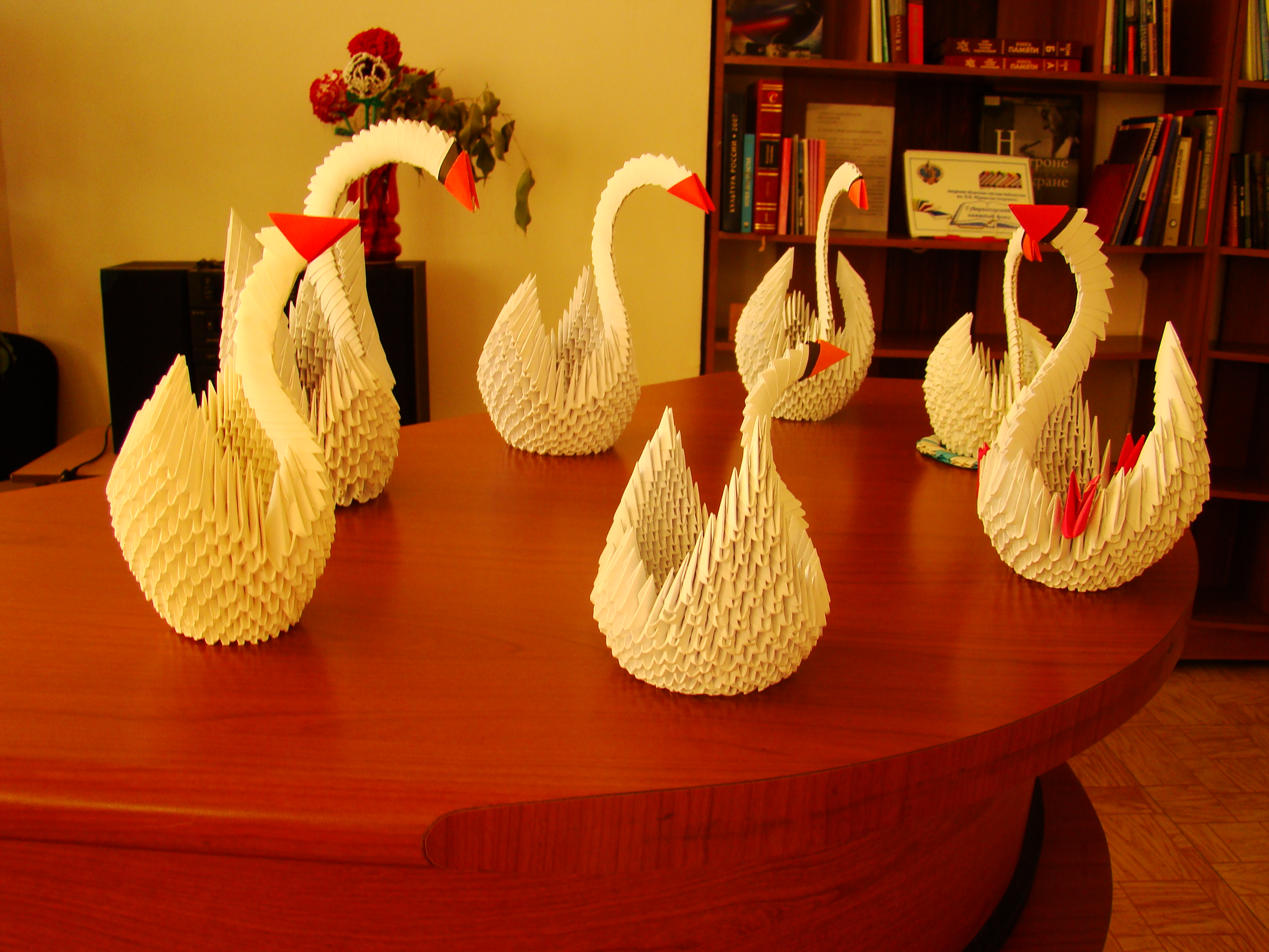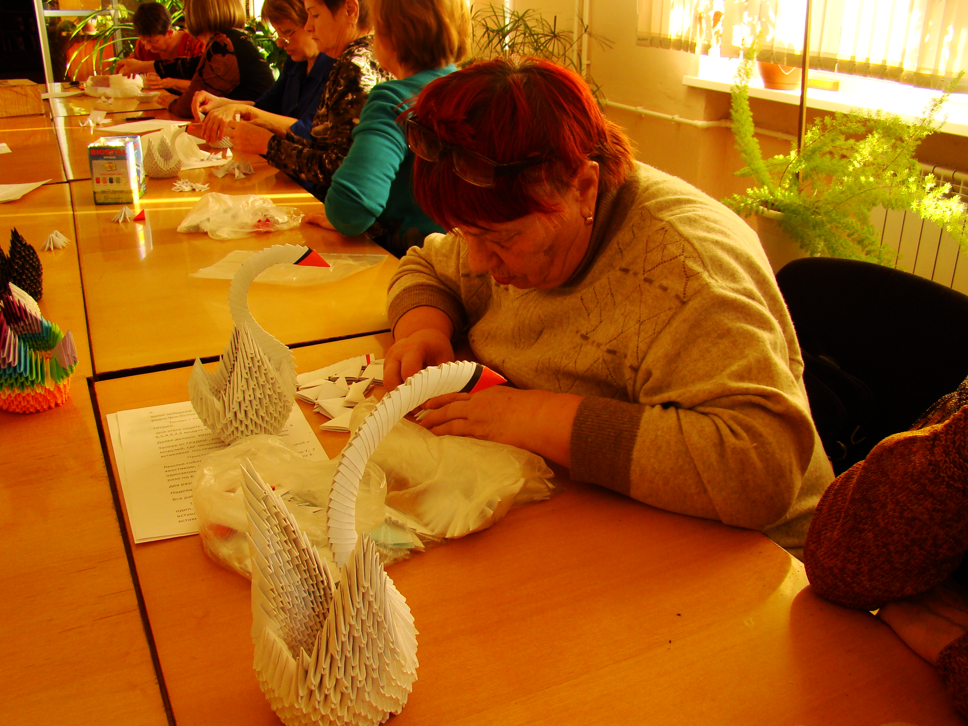 Многочасовой кропотливый труд по изготовлению модулей оригами и постижению техники их соединения увенчался успехом. В руках каждой рукодельницы оказался белоснежный лебедь. Десяток важных птиц составили новую коллекцию изделий очередного заседания клуба «Ручная работа».