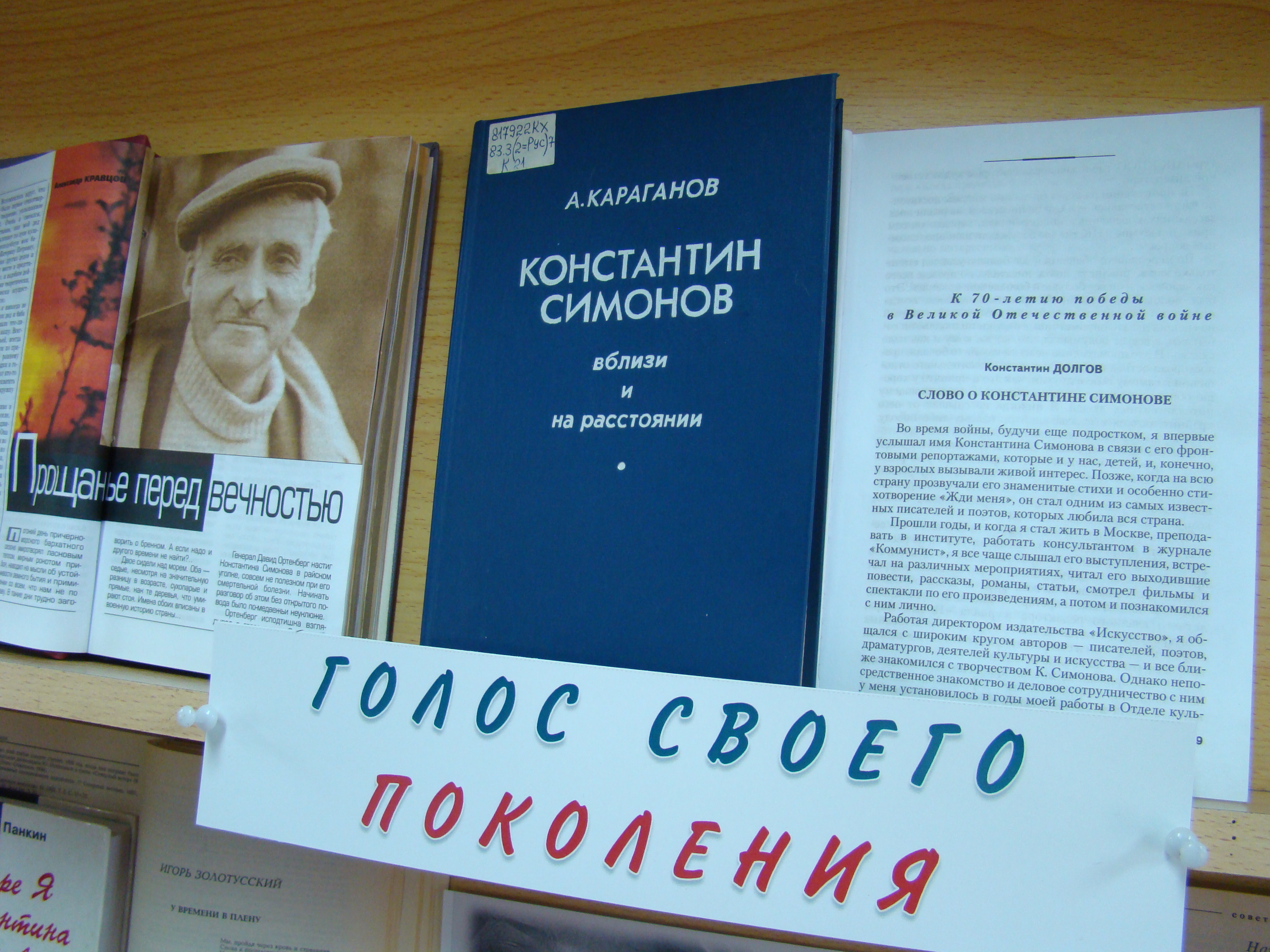 В разделе выставки «Голос своего поколения» представлены книги, рассказывающие о К. Симонове-военном корреспонденте, с первых дней Великой Отечественной войны побывавшем на всех фронтах, ставшем свидетелем последних боев за Берлин, вынесшем с поля боя слова – краткие, как выстрелы, и точные, как сама правда. Симонов войну знал не понаслышке, испытал на себе ка рядовой солдат. В июле 1941 года в Белоруссии он с нашими частями выбирался из окружения. В Крыму ходил с пехотой в атаку. За Полярным кругом с моряками пробирался во вражеский тыл. Был в сожжённом Сталинграде, осаждённой Одессе и на Курской дуге. Участвовал в боевом походе подводной лодки. Побывал у партизан Югославии.
