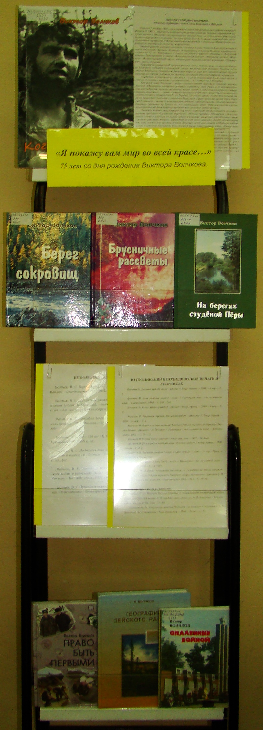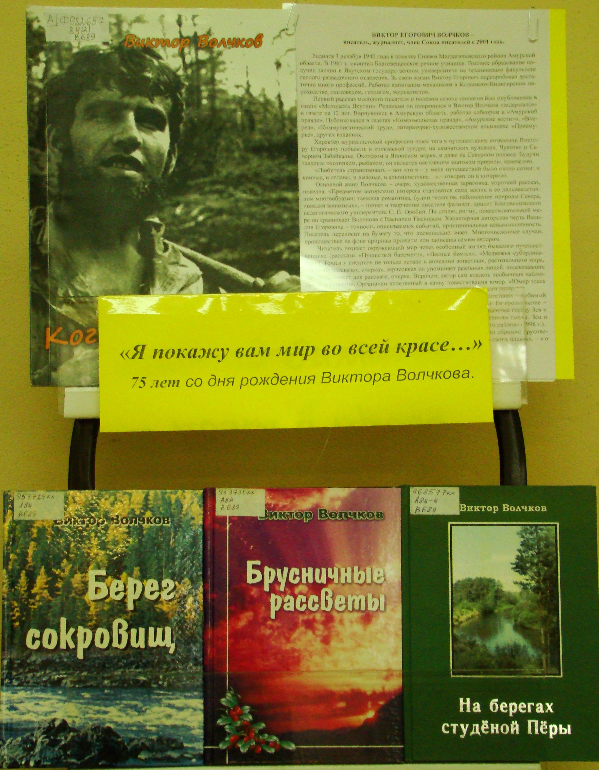 В отделе краеведения и редких книг открылась выставка из цикла "Юбилейный вернисаж амурских писателей" "Я покажу вам мир во всей красе...", посвящённая творчеству Виктора Волчкова.