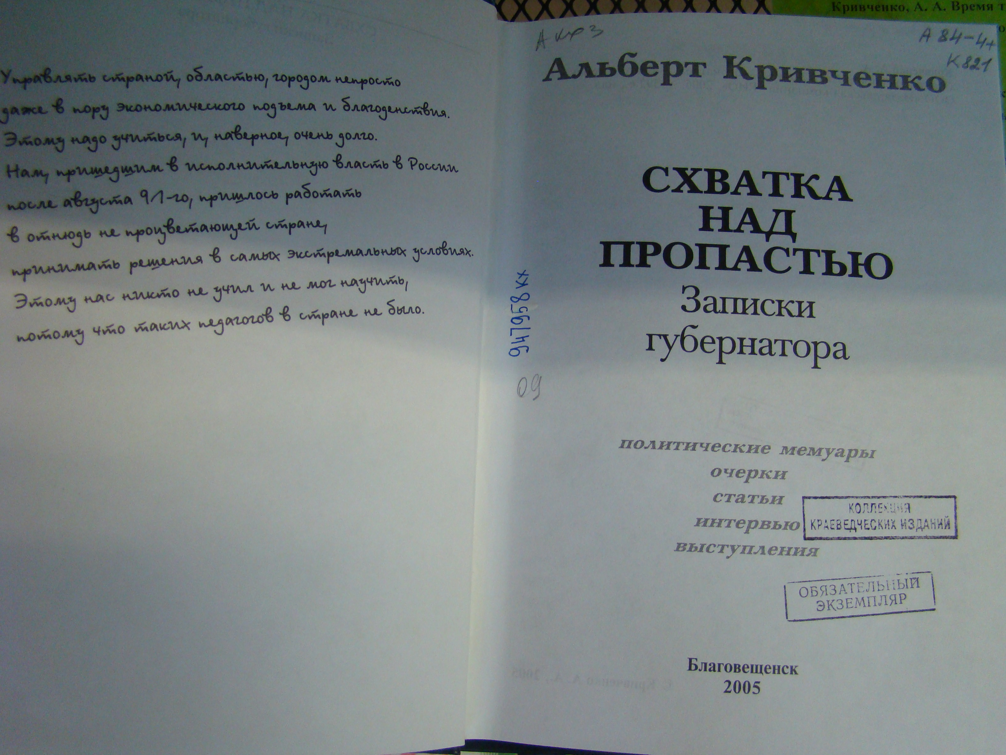 - политические мемуары «Схватка над пропастью. Записки губернатора» - широкомасштабное полотно важнейших событий российской истории;