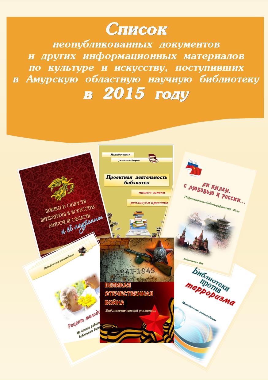 Список неопубликованных документов и других информационных материалов по культуре и искусству, поступивших в Амурскую областную научную библиотеку в 2015 году можно найти на нашем сайте, в разделе "Ресурсы. Издания АОНБ" и в фонде библиотеки.