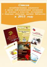 Амурской областной научной библиотекой издан Список неопубликованных документов и других информационных материалов по культуре и искусству, поступивших в Амурскую областную научную библиотеку в 2015 году. Составитель издания Л.П. Кочнева, заведующий отделом библиографии и электронных ресурсов.